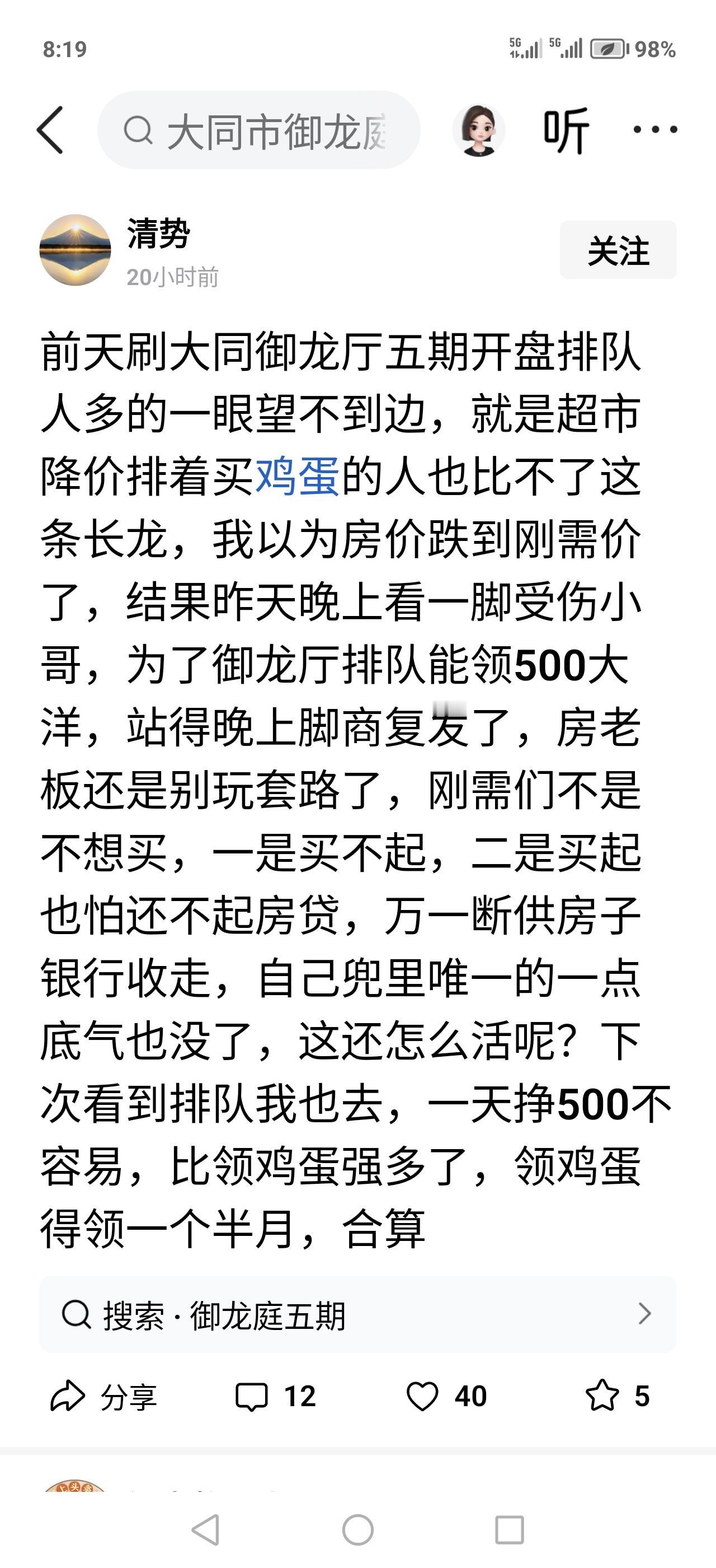 对御龙庭五期房子,卖了卖不了我不感兴趣,我感兴趣的是,如果一天给我五百,我就去排队当演员。