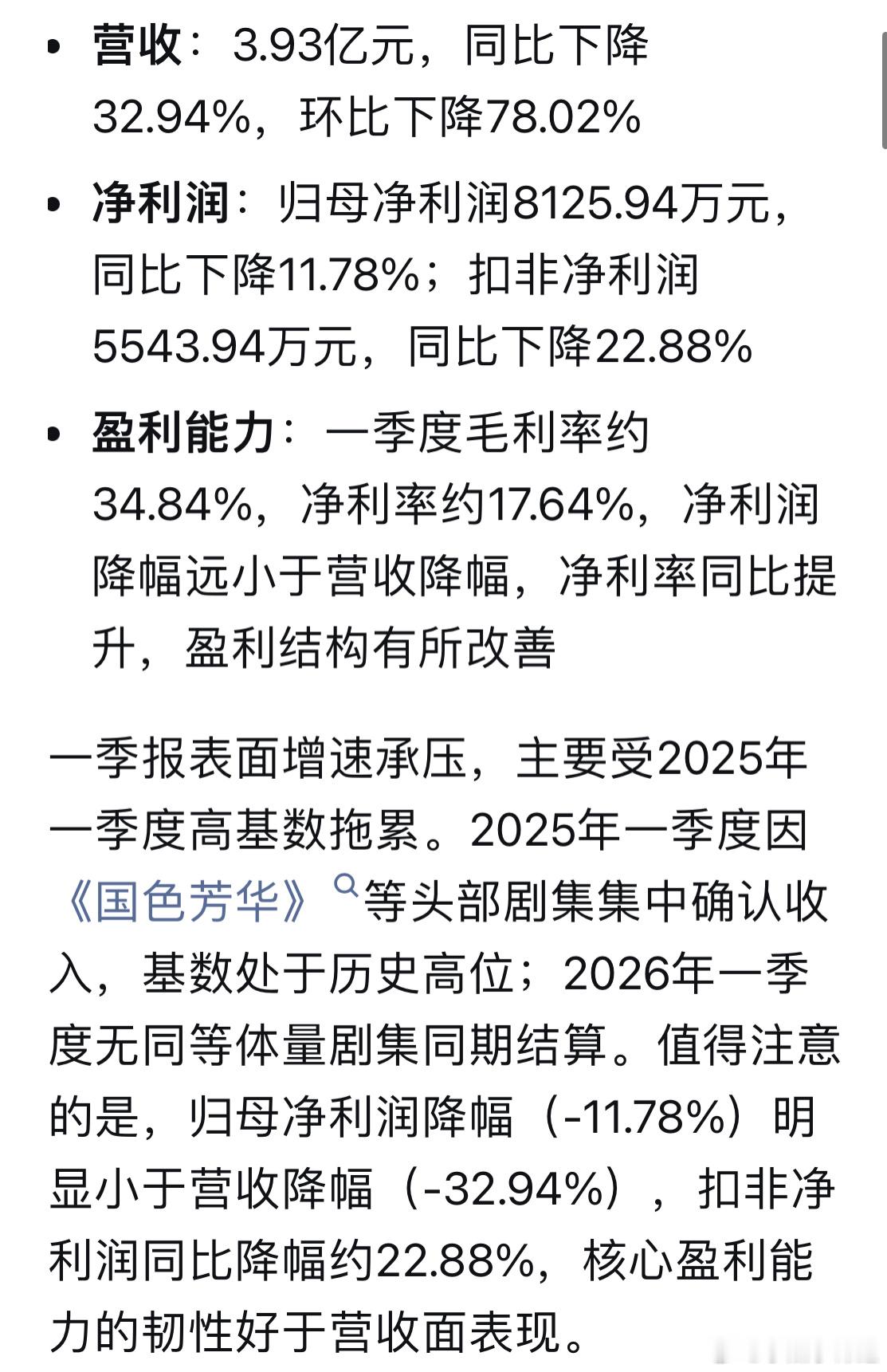 华策影视 2026 年一季报,指出虽然营收同比下滑超 30%,但这主要是因为 2025 年同期有爆款剧《国色芳华》确认收入导致基数过高 ,可见国色芳华的创收效果。杨紫扛剧能力和创收能力