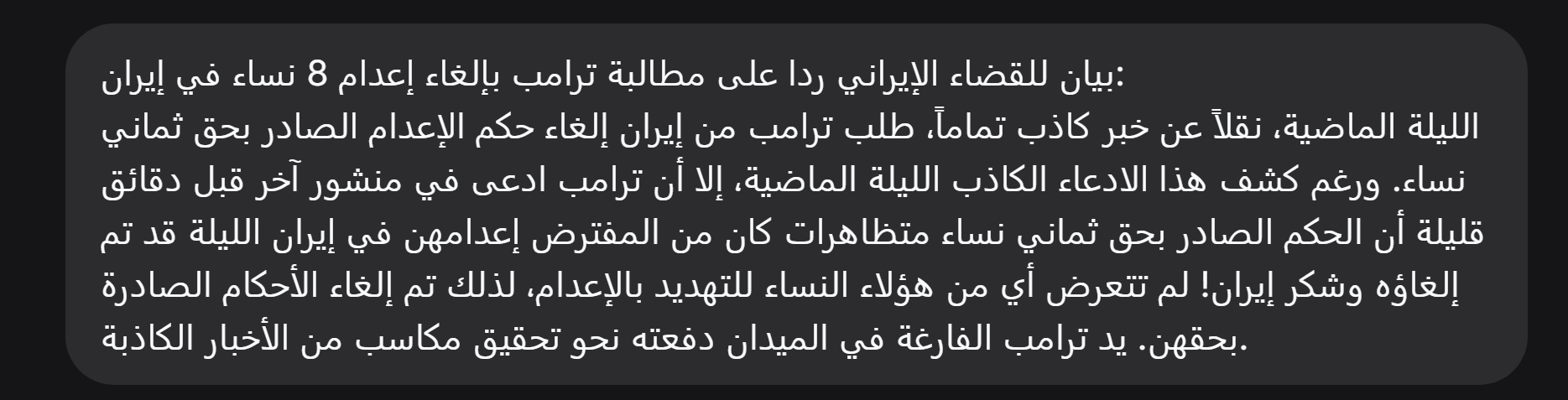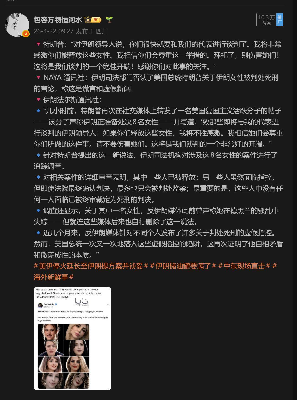 🔻特朗普声称:“这是个极好的消息!我刚刚得知,原定于今晚在伊朗被处决的八名抗议者将不会被处决。其中四人将立即获释,另外四人将被判处一个月监禁。我非常感激伊朗及其领导人尊重我作为美国总统的请求,终止了原定的处决行动。”🔻伊朗司法部门针对特朗普要求取消对伊朗8名女性死刑判决的声明作出回应:“昨晚,特朗普基于一则完全虚假的消息,要求伊朗取消对八名女性的死刑判决。尽管这一虚假指控已于昨晚被揭穿,但几分钟前,特朗普在另一份声明中却声称,伊朗原定于今晚处决的八名女性抗议者的死刑判决已被撤销,并感谢了伊朗!这些女性从未面临过死刑威胁。特朗普在这场博弈中空手而归,只能通过捏造虚假消息来谋求利益。”🔻此前,也就是昨天,特朗普发帖声称:“对伊朗领导人说,你们很快就要和我们的代表进行谈判了。我将非常感激你们能释放这些女性。我相信你们会尊重这一举措的。拜托了,别伤害她们!这将是我们谈判的一个绝佳开端!感谢你们对此事的关注。”🔻伊朗司法部门当时就否认了特朗普关于伊朗女性被判处死刑的言论,称这是谎言和虚假新闻。🔻伊朗法尔斯通讯社之前称:“几小时前,特朗普再次在社交媒体上转发了一名美国复国主义活跃分子的帖子——该分子声称伊朗正准备处决8名女性——并写道:‘致那些即将与我的代表进行谈判的伊朗领导人:如果你们释放这些女性,我将不胜感激。我相信她们会尊重你们所做的这件事。请不要伤害她们。这将是我们谈判的一个非常好的开端。’针对特朗普提出的这一新说法,伊朗司法机构对涉及这8名女性的案件进行了追踪调查。对相关案件的详细审查表明,其中一些人已被释放;另一些人虽然面临指控,但即使法院最终确认判决,最多也只会被判处监禁;最重要的是,这些人中没有任何一人面临已被终审裁定为死刑的判决。调查还显示,关于其中一名女性,反伊朗媒体此前曾声称她在德黑兰的骚乱中失踪——但就连这些媒体后来也自行删除了这一说法。近几个月来,反伊朗媒体针对不同个人发布了许多关于判处死刑的虚假指控。然而,美国总统一次又一次地落入这些虚假指控的陷阱,这再次证明了他自相矛盾和撒谎成性的本质。”🔻特朗普现在发起的是谎言 DDoS 攻击,突出一个量大、复读,一方面污染量化、讲给美国金融市场听,另一方面讲给 MAGA 听。🔻因为美国金融市场和 MAGA 需要谎言,维持赢学。🔻这就是所谓因信称义、赢我合一。🔻NAYA 通讯社的报道伊朗公开展示大杀器 卢拉调侃赶紧给特朗普颁奖 海外新鲜事 中东现场直击