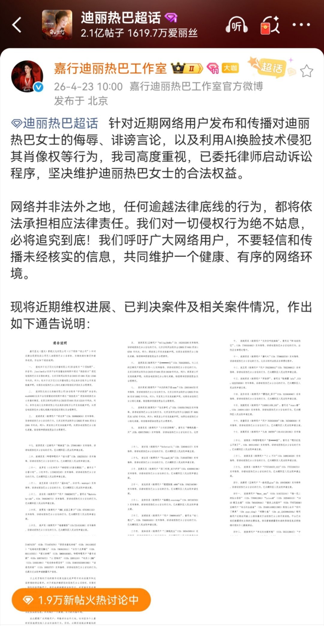 迪丽热巴工作室公布告黑维权名单,抖音、豆瓣、微博、b站、今日头条全网取证。(又看