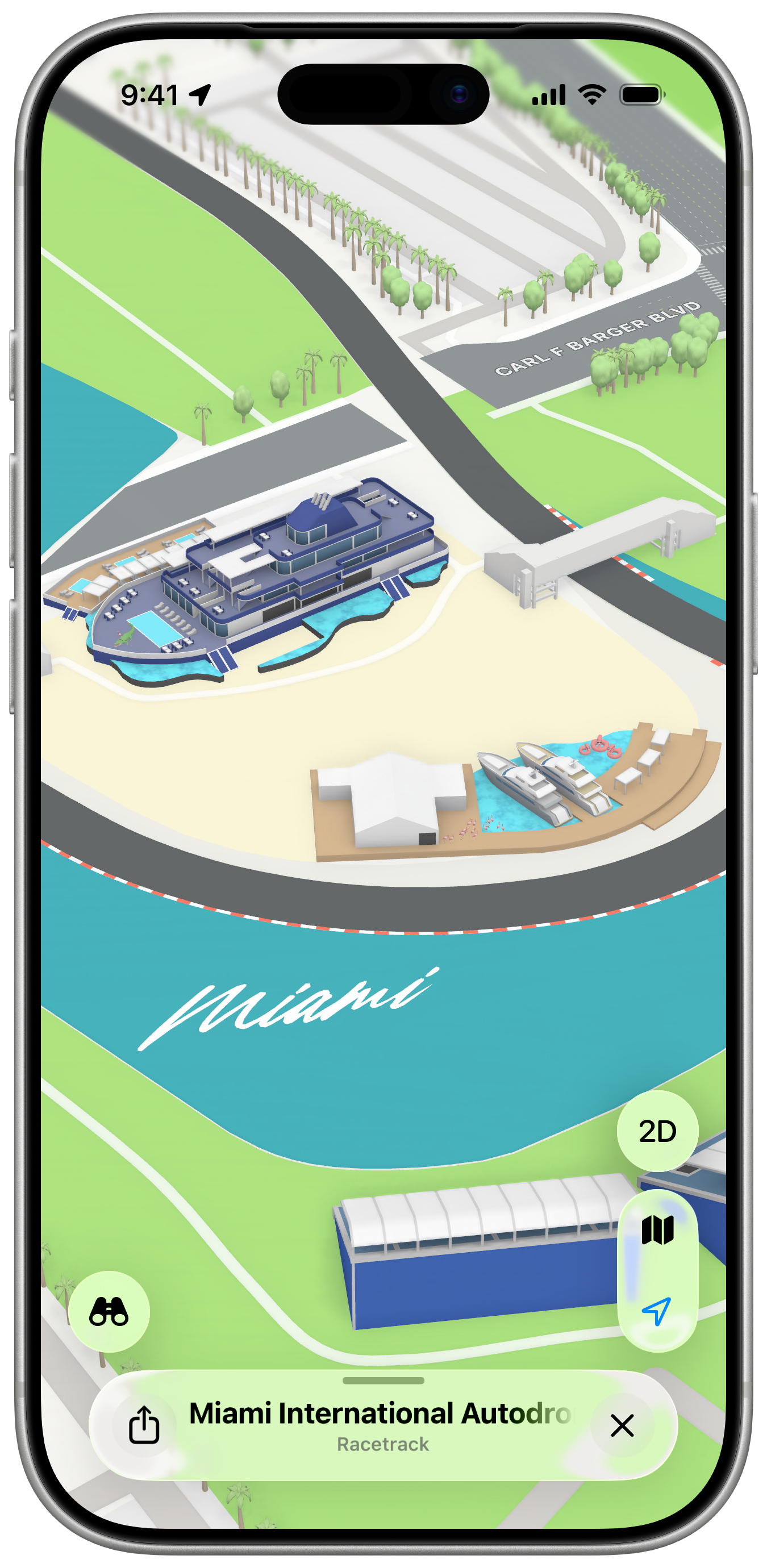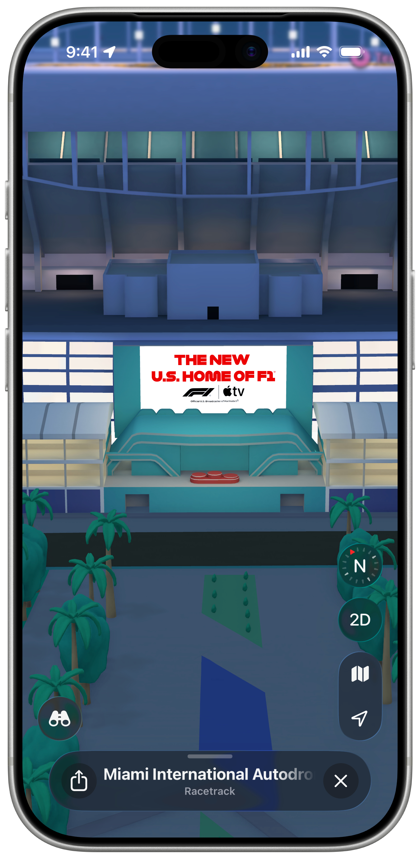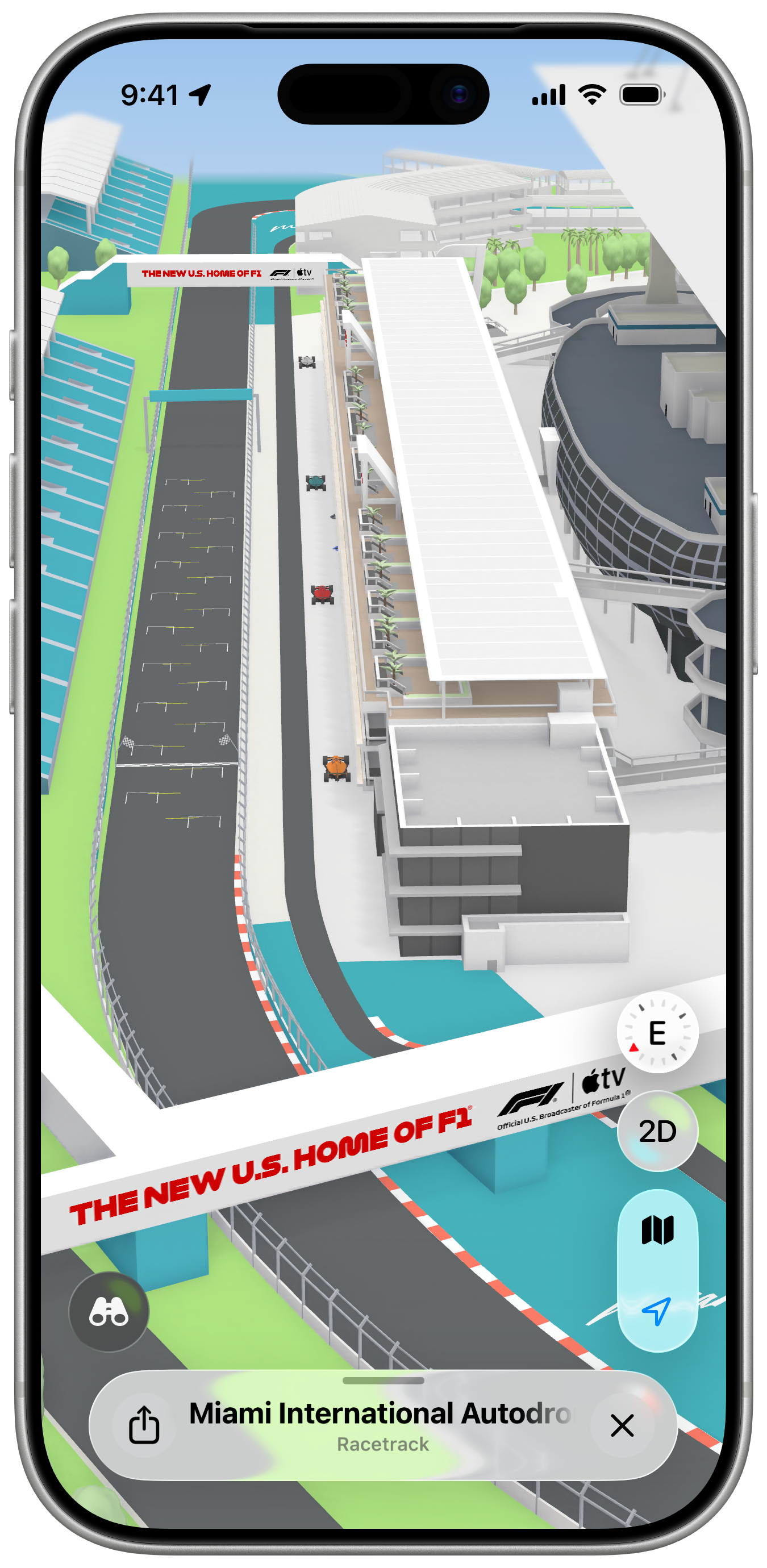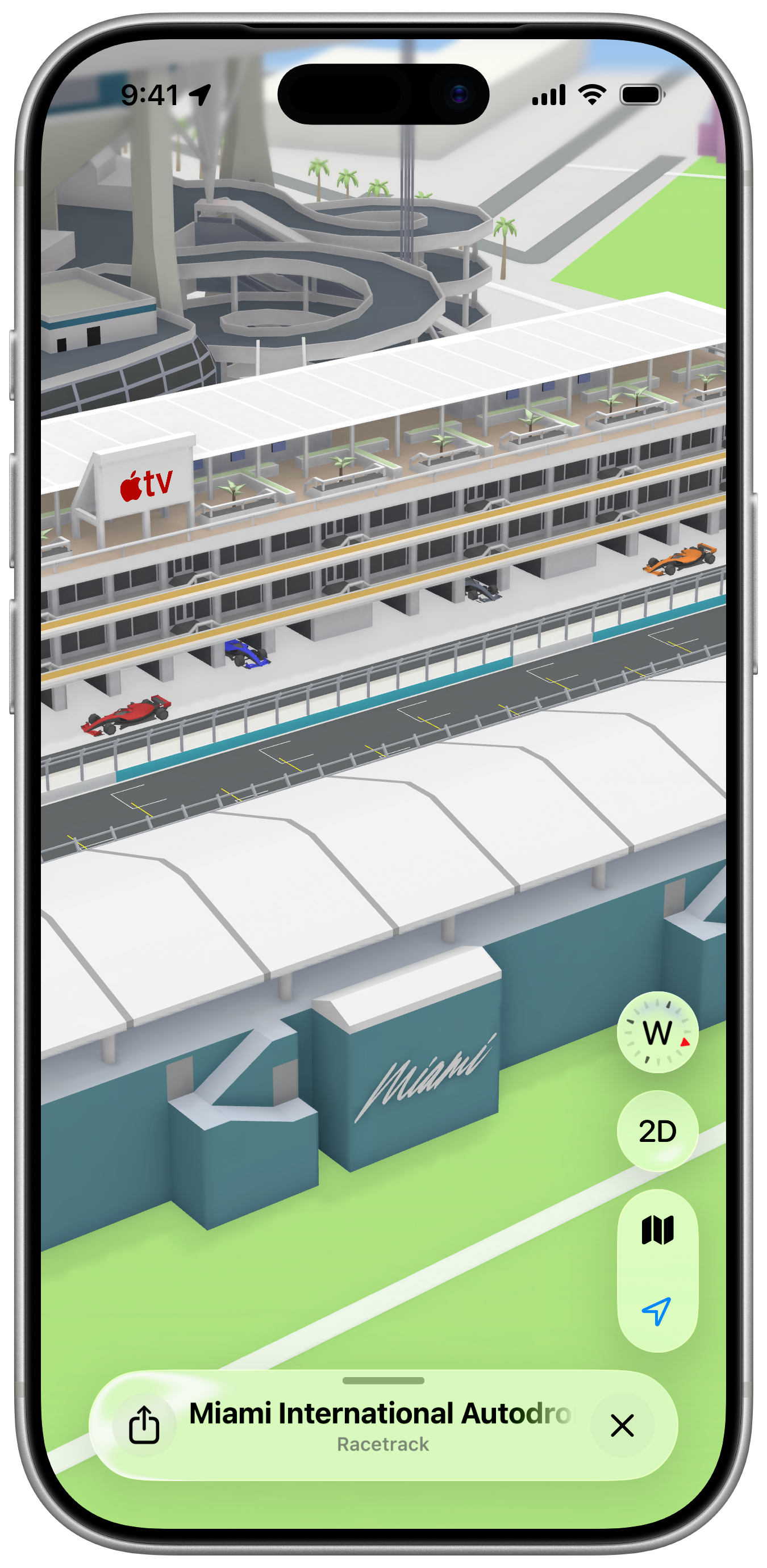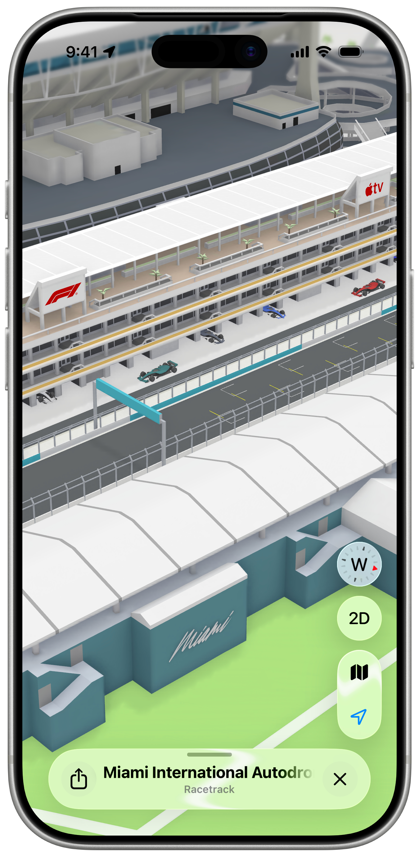 全新的迈阿密 F1 大奖赛体验今日在 Apple 地图推出。该体验以令人惊艳的方式展现了迈阿密国际赛车场的关键地点,包括看台、码头、终点线等 3D 地标。甚至连维修站大楼都以 3D 形式呈现,赛车清晰可见。