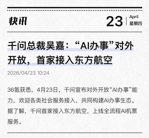 以前千问也能订外卖、打车、买电影票——淘宝闪购、高德、淘票票,但是都是自家人。这次东航是真正的外部合作伙伴,这意味着千问的“AI办事”能力第一次走出了自己的生态。