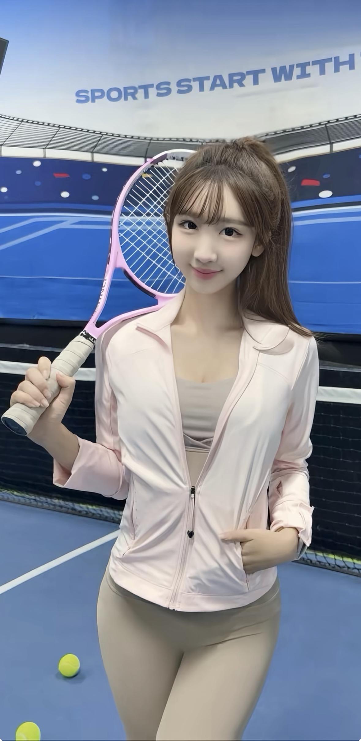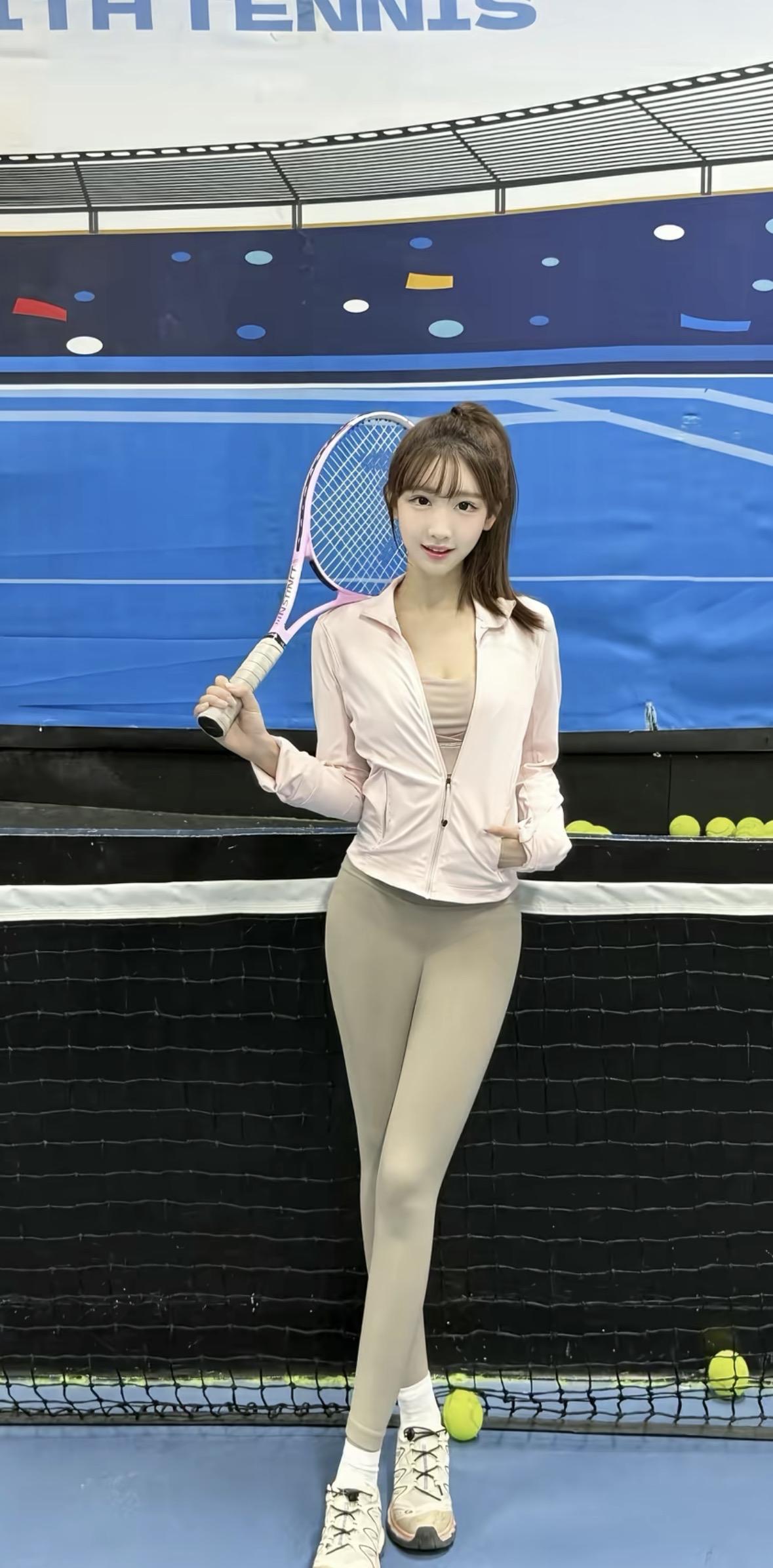 简约粉色修身上衣勾勒出纤细腰肢,瑜伽裤又展现出白皙笔直的大长腿,运动风与时尚感完美融合。利落高马尾搭配几缕碎发,俏皮感十足,挥拍时专注,休憩时惬意,满满少年感。