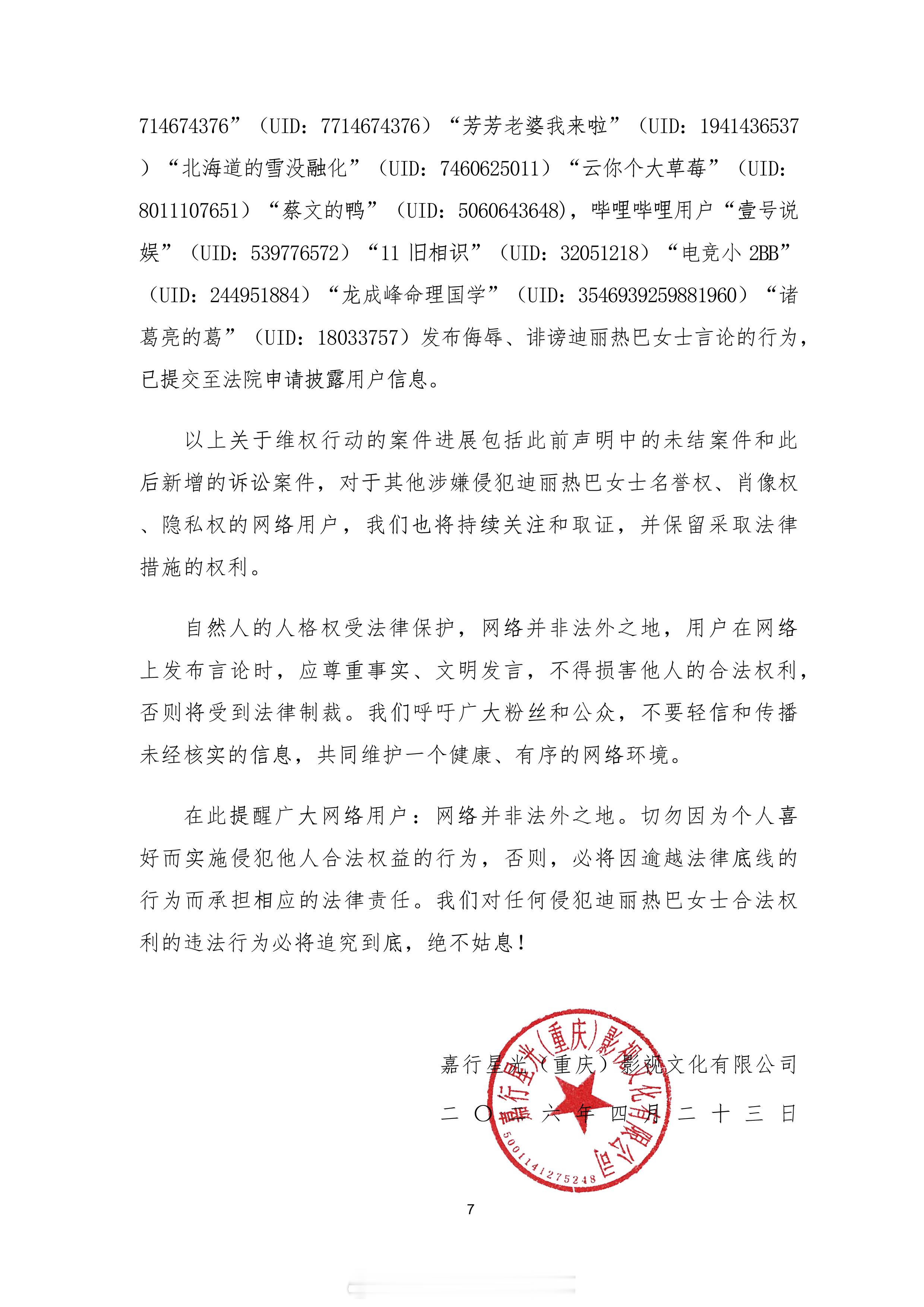 迪丽热巴工作室针对近期网络用户发布和传播对迪丽热巴女士的侮辱、诽谤言论,以及利用