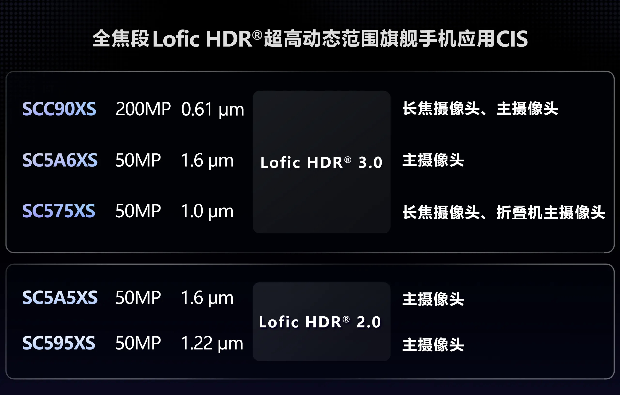 SCC90XS去年底预告过了,200Mp 1/1.28"超大底,22nm先进制程,Lofic HDR 3.0,动态范围最高105dB,支持4K 240fps超高帧率视频or4K 60fps Lofic HDR 3.0超高动态视频,官方提供主摄端及长焦端的解决方案。