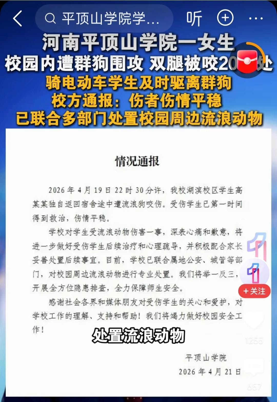 另一件在河南平顶山学院,一个女大学生晚上回宿舍路上,被一群流浪狗围攻,双腿咬了20多处。校方通报说人已送医,伤情平稳,正联合公安、城管处置校园周边流浪狗。