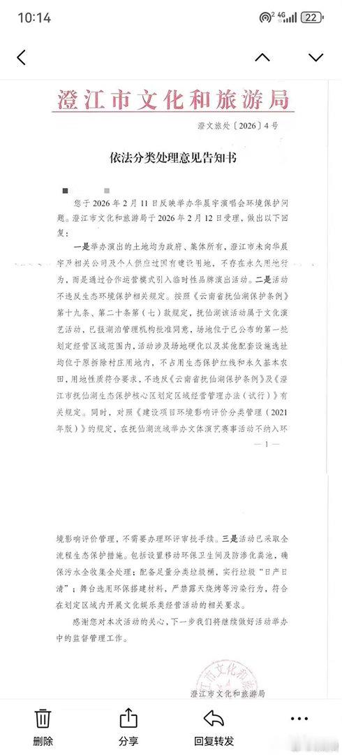 华晨宇云南演唱会那个事,原来澄江文旅局早就回应过了,只是最近才被网友翻出来晒。文件里写得明明白白:地是政府集体所有,没占生态红线,没占基本农田,环保措施全部到位。华晨宇方还承诺每张票捐10块给抚仙湖。之前传的“不可抗力”大概率真跟环保没啥关系,怎么看都更像是因为泼水节的舆情而受影响呢。
