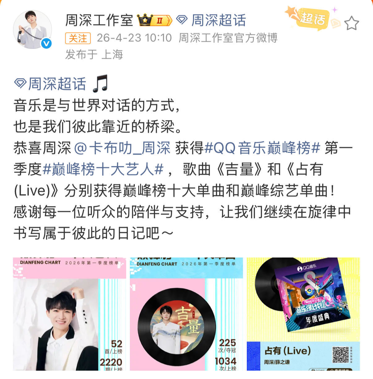 周深同时入围十大艺人和单曲 第一季度巅峰榜双料认证!周深不仅拿下十大艺人,两首神作《吉量》《占有(Live)》还分别斩获十大单曲&综艺单曲!这排面🈶!