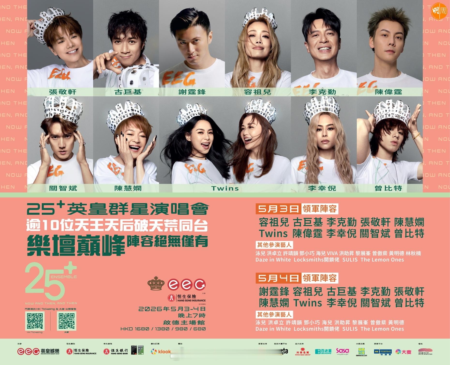 《25+ 英皇群星演唱会》将于5月3日及4日在启德主场馆举行。继早前公布5月4日表演名单后,大会今日再公布5月3日阵容,包括容祖儿、古巨基、李克勤、张敬轩、陈慧娴、Twins、陈伟霆、李幸倪、关智斌、曾比特等。