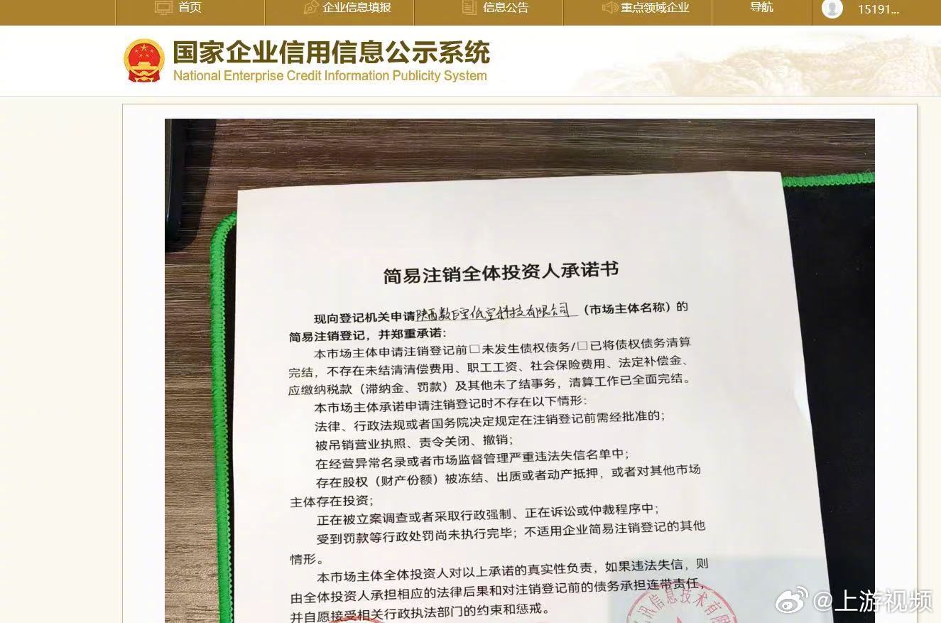 3月19日,陕西数巨宝低空科技有限公司已通过西安当地市场监督管理部门简易注销程序注销了该公司。并以书面形式承诺“清算工作已全面完结”。公告期为3月20日至4月9日。而该公司从注册到注销仅仅存在了2个多月。(上游新闻记者 贾晨)