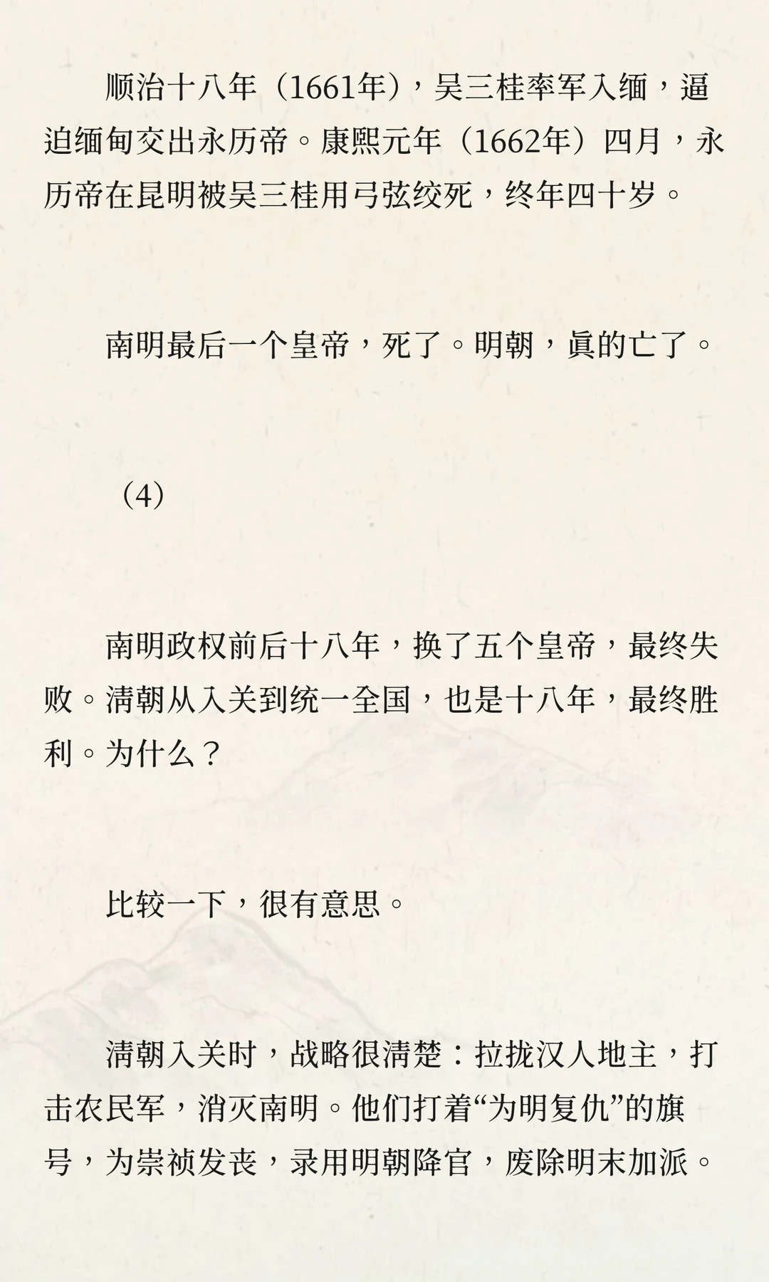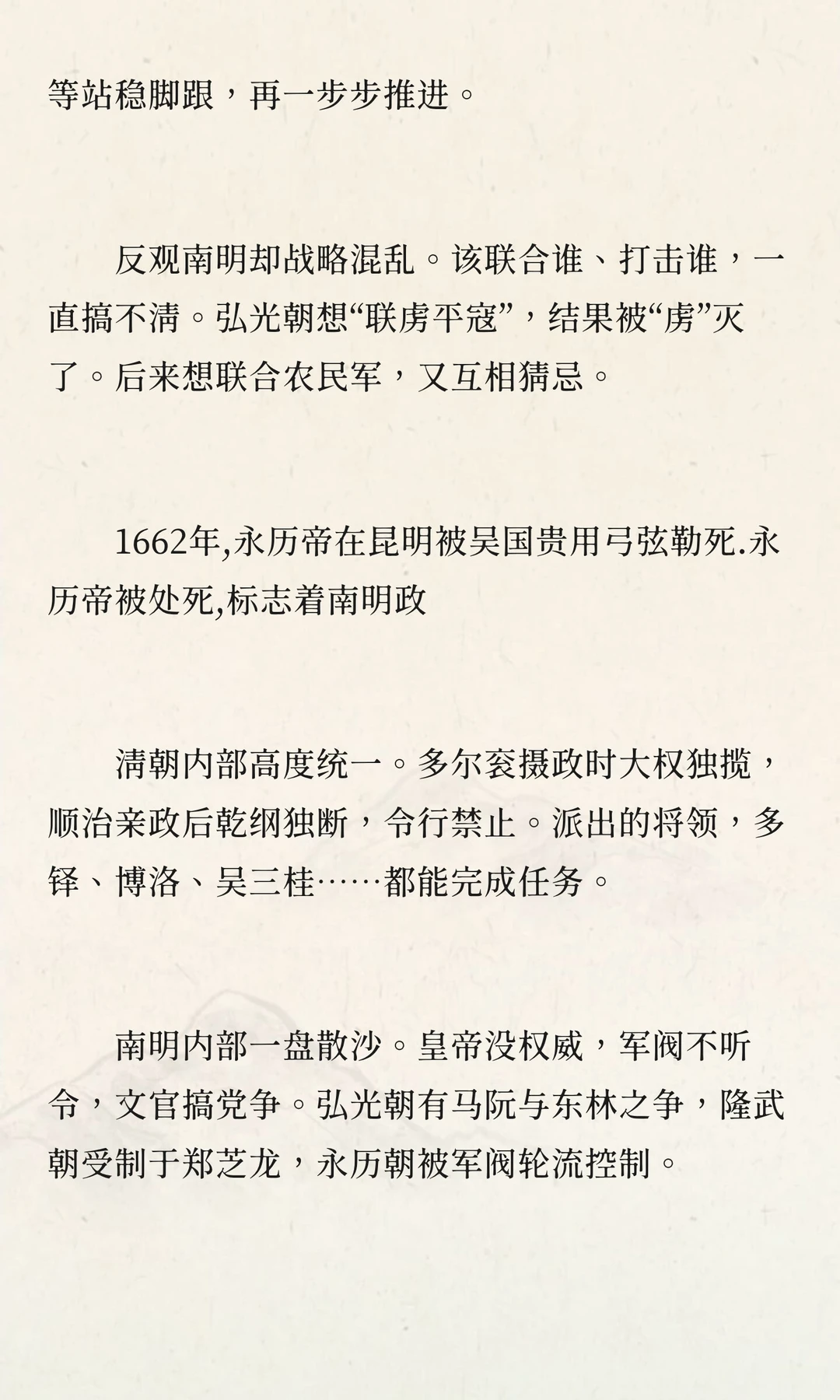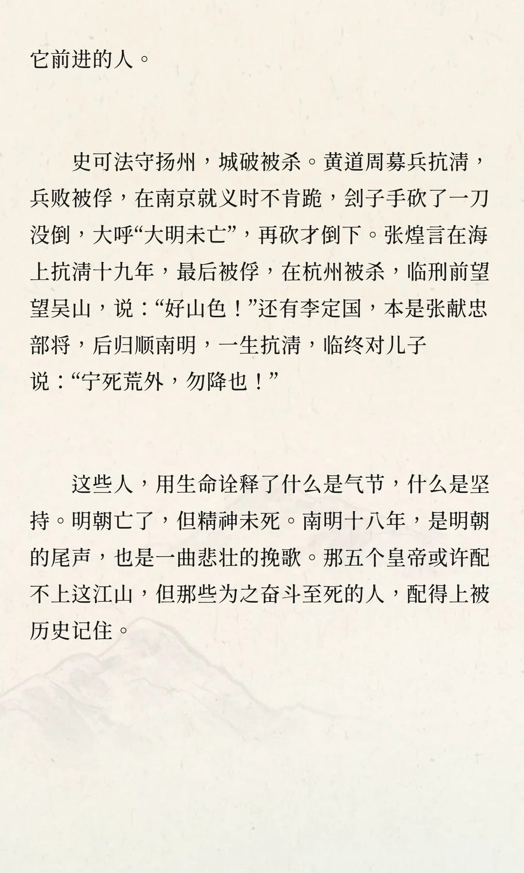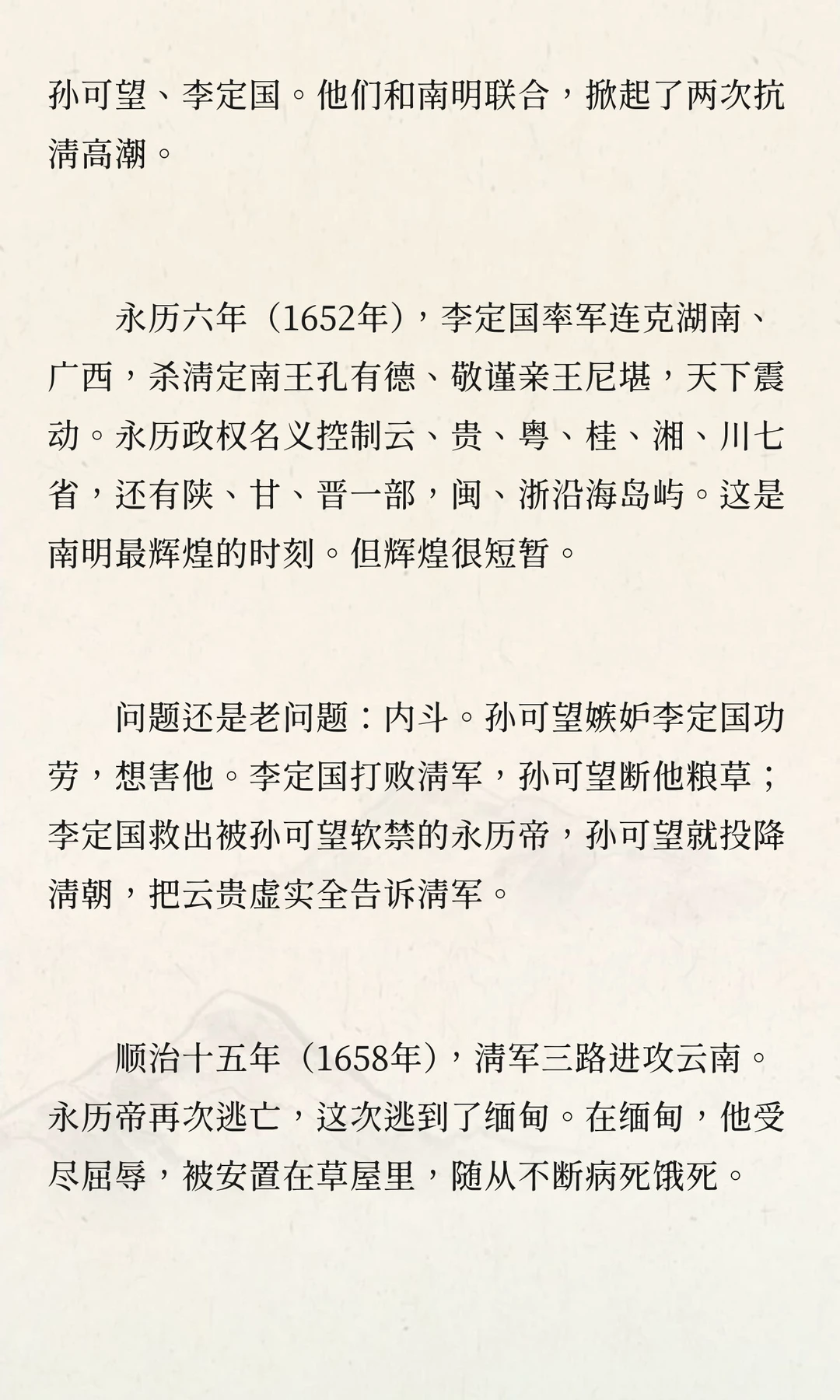 南明政权在清军入关后仅存在十八年,经历了五个皇帝的更迭,最终在永历帝被吴三桂杀害后彻底覆灭。尽管战略混乱、内部纷争不断,但抗清斗争中仍然展现了明朝遗民的气节与坚持,成为历史长河中的一曲悲壮挽歌。