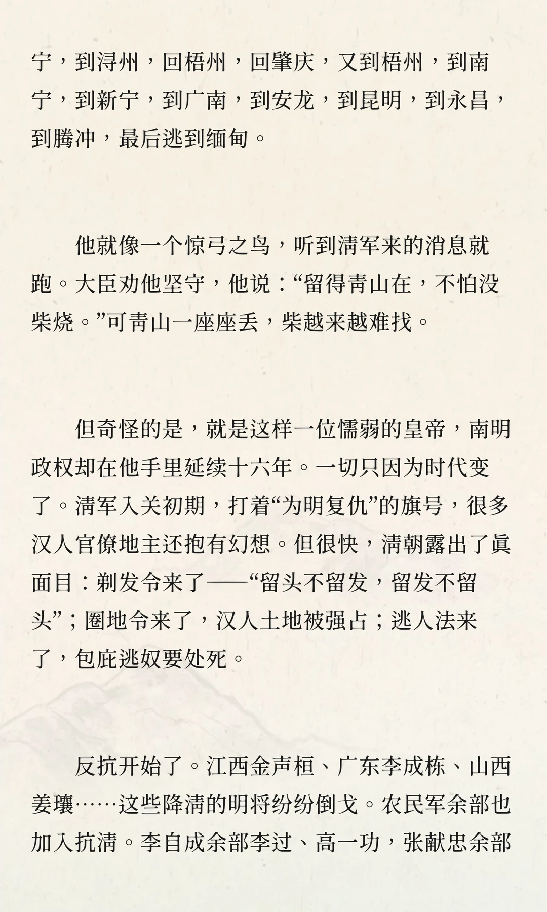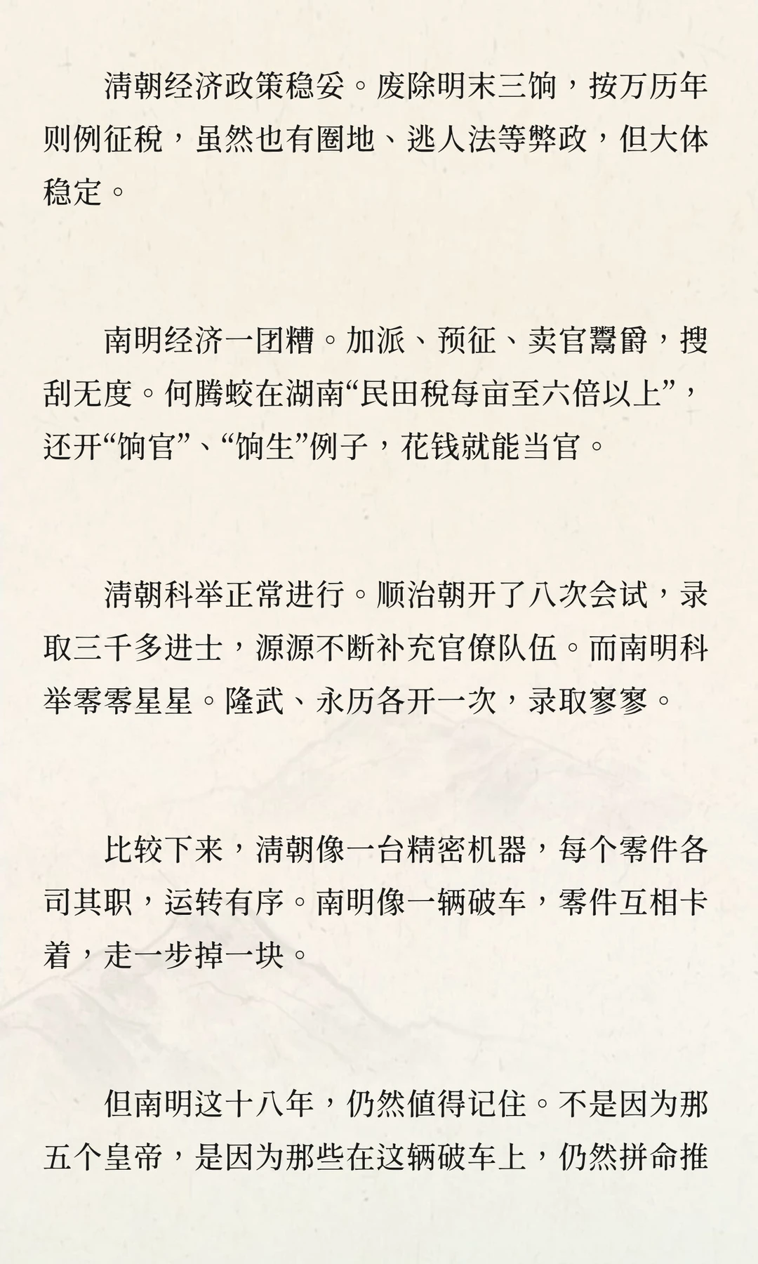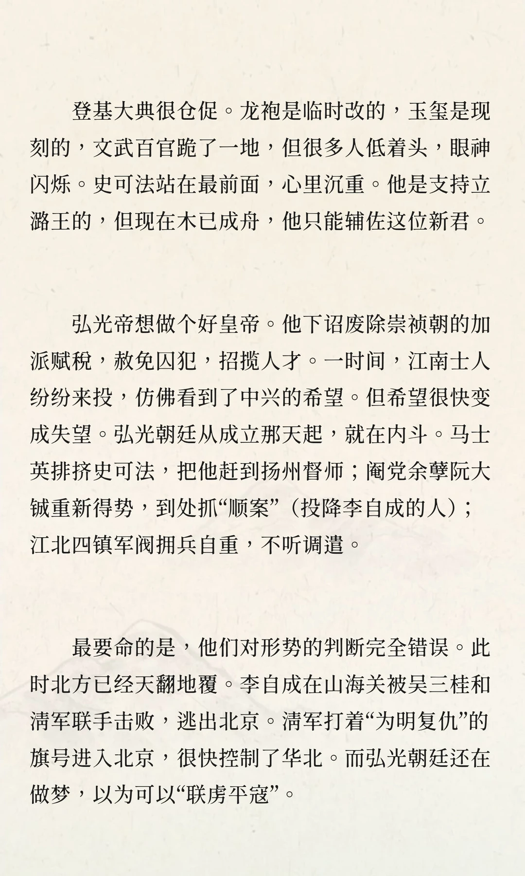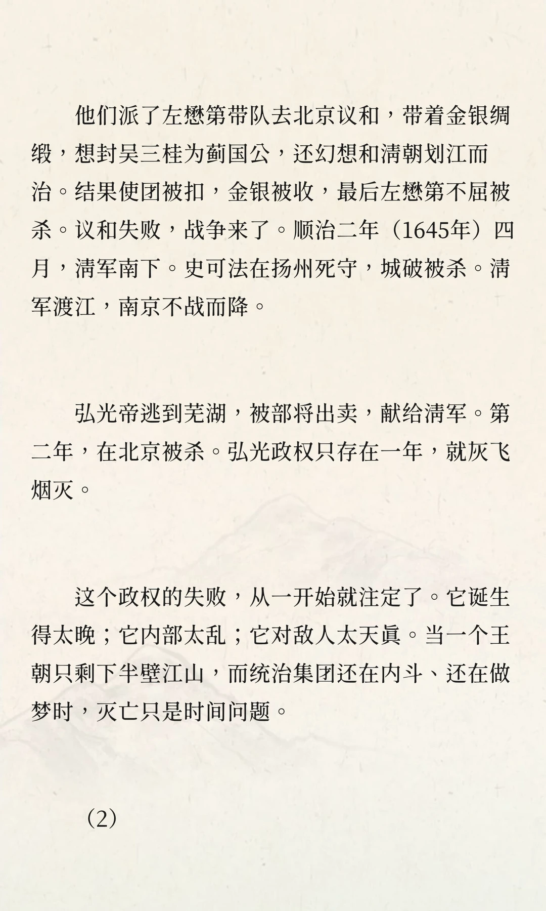 南明政权在清军入关后仅存在十八年,经历了五个皇帝的更迭,最终在永历帝被吴三桂杀害后彻底覆灭。尽管战略混乱、内部纷争不断,但抗清斗争中仍然展现了明朝遗民的气节与坚持,成为历史长河中的一曲悲壮挽歌。
