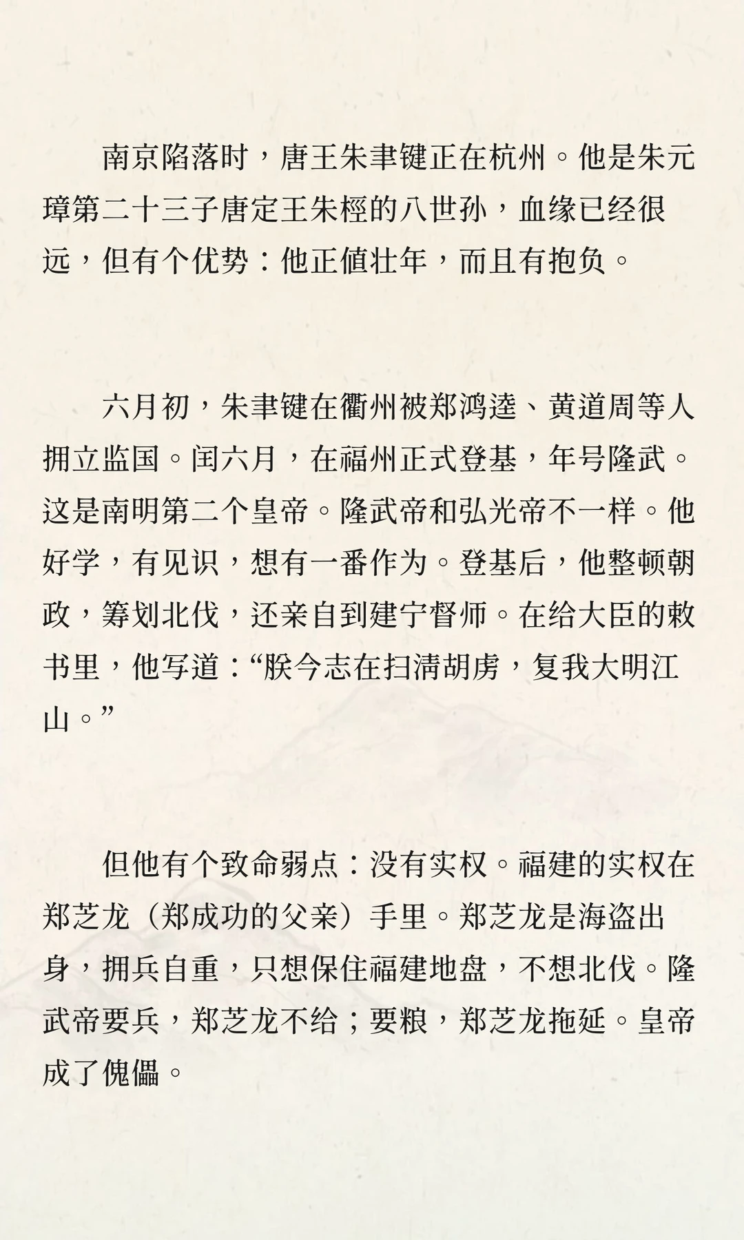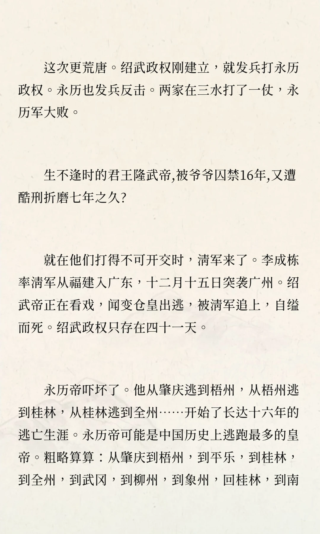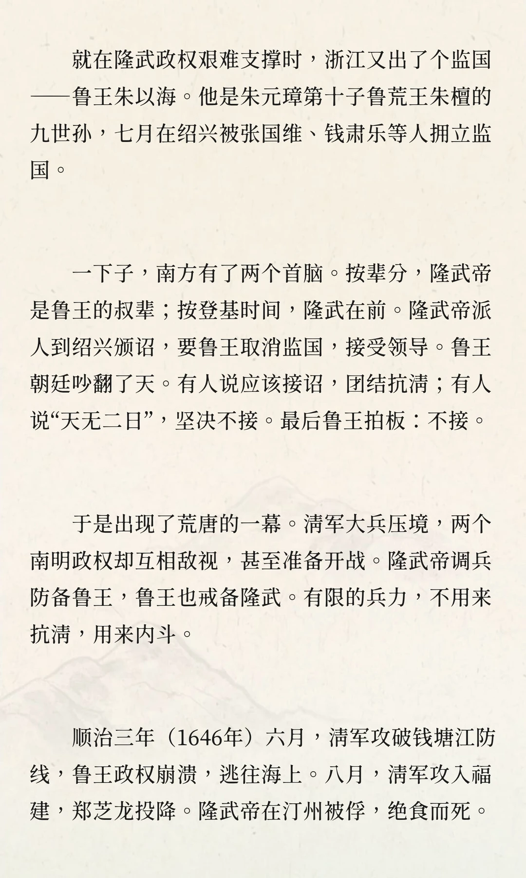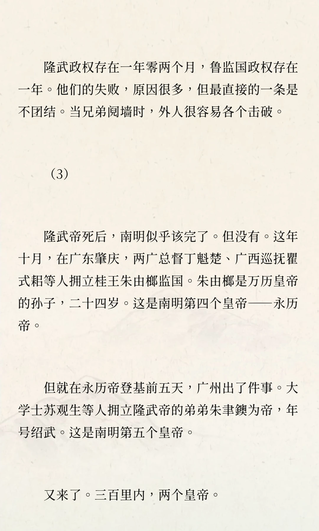 南明政权在清军入关后仅存在十八年,经历了五个皇帝的更迭,最终在永历帝被吴三桂杀害后彻底覆灭。尽管战略混乱、内部纷争不断,但抗清斗争中仍然展现了明朝遗民的气节与坚持,成为历史长河中的一曲悲壮挽歌。