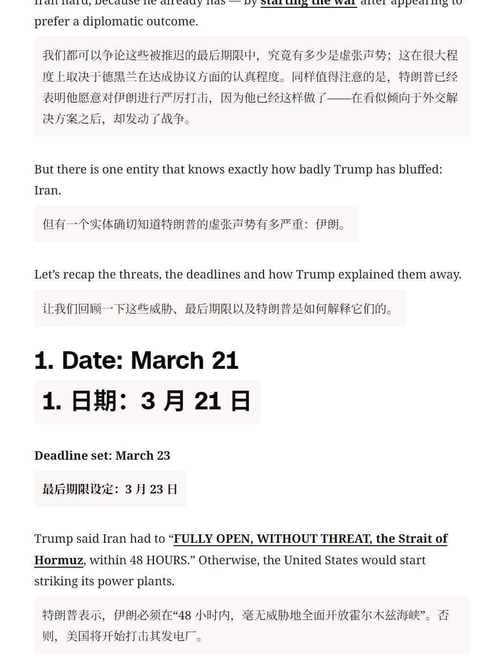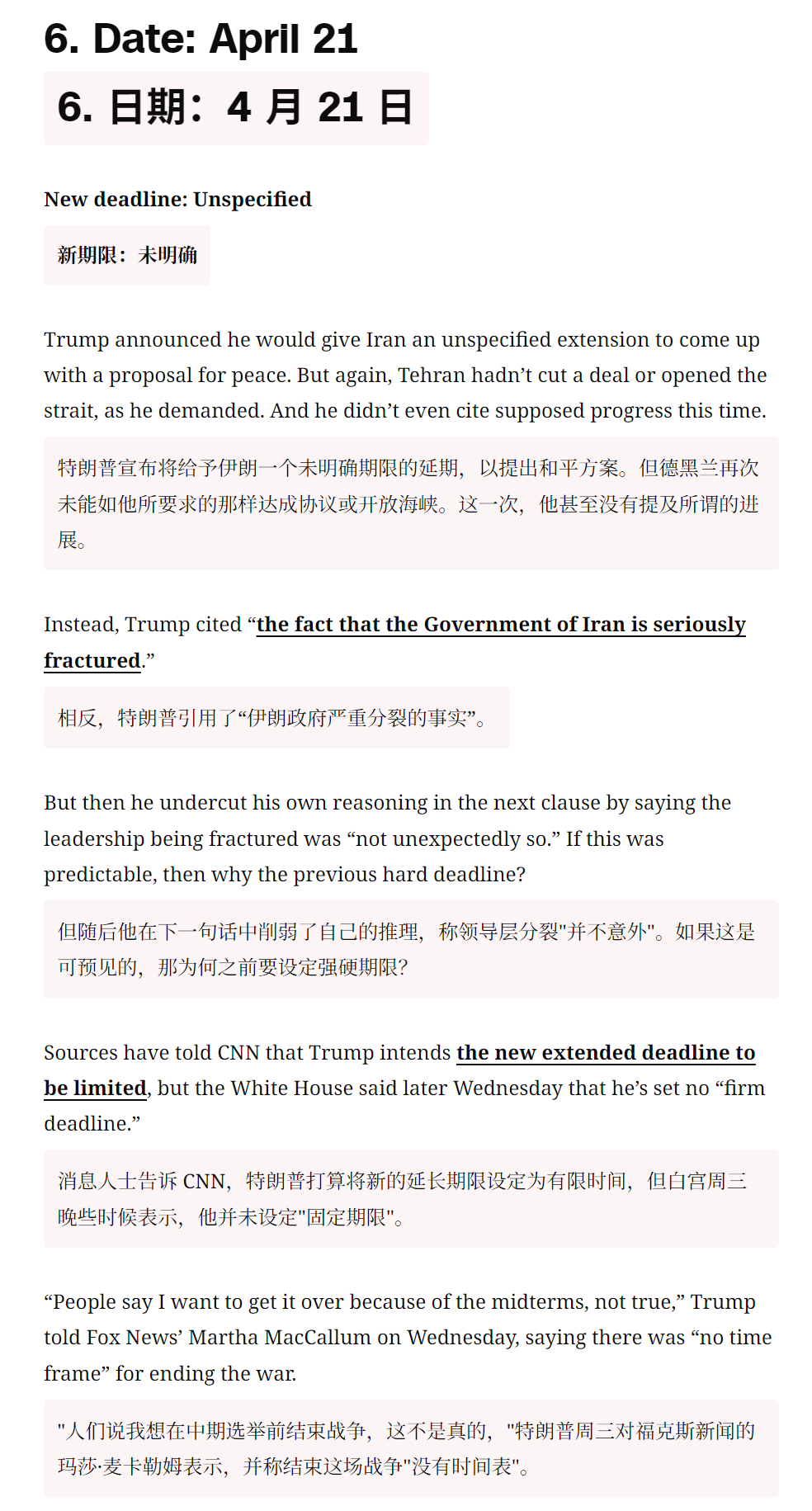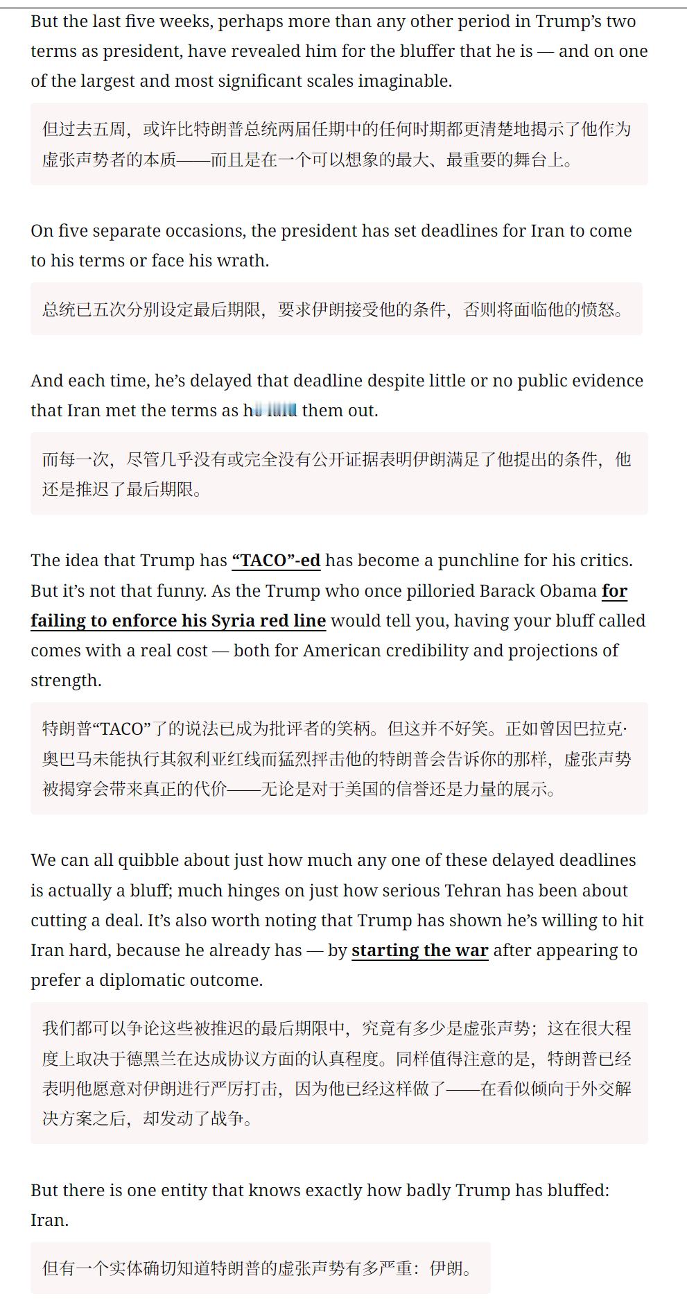 🔻CNN:特朗普对伊朗虚张声势的意义。🔻在伊朗战争爆发的第五天,3 月 4 日,白宫新闻秘书卡罗琳·莱维特向美国敌人发出挑衅性信息,“特朗普总统从不虚张声势。”🔻CNN 称,鉴于特朗普在俄乌战争中屡次发出空洞威胁并错过最后期限的前科,这番表态本身已值得怀疑。🔻过去五周,或许比特朗普总统两届任期中的任何时期都更清楚地揭示了他作为虚张声势者的本质——而且是在一个可以想象的最大、最重要的舞台上。🔻特朗普已六次分别设定最后期限,要求伊朗接受他的条件,否则将面临他的愤怒。🔻而每一次,尽管几乎没有或完全没有公开证据表明伊朗满足了他提出的条件,他还是推迟了最后期限。特朗普“TACO”了的说法已成为批评者的笑柄。但这并不好笑。正如曾因巴拉克·奥巴马未能执行其叙利亚红线而猛烈抨击他的特朗普会告诉你的那样,虚张声势被揭穿会带来真正的代价——无论是对于美国的信誉还是力量的展示。🔻然后 CNN 逐一列举了特朗普的六次最后通牒:🔹1. 日期:3 月 21 日,最后期限设定:3 月 23 日,特朗普表示,伊朗必须在“48 小时内,毫无威胁地全面开放霍尔木兹海峡”。否则,美国将开始打击其发电厂。🔹2. 日期:3 月 23 日,新最后期限设定:3 月 28 日,距离最后期限仅剩约 12 小时,特朗普宣布将期限推迟五天。然而,伊朗并未如他所要求的那样重新开放霍尔木兹海峡,他反而引用了双方之间“非常良好且富有成效的对话”。🔹3. 日期:3 月 26 日,新的截止日期定在 4 月 6 日,特朗普表示,他将最后期限再延长八天,理由是“伊朗政府要求”更多时间,而且谈判“进展非常顺利”。但伊朗一名高级官员表示,双方只是“交换了信息”,并非真正的谈判。而美国在这场战争中的盟友以色列则暗示,伊朗实际上并没有认真谈判。🔹在随后的几天里,特朗普为 4 月 6 日的最后期限设定了条件。他的要求是“达成一项协议”,并且霍尔木兹海峡必须“立即'开放营业'”。如果未能实现,他将炸毁伊朗所有的发电厂、油井和哈尔克岛,甚至可能包括该国所有的海水淡化厂。(特朗普在此威胁的举动很可能构成战争罪。)他后来补充说,如果霍尔木兹海峡“开放、自由且畅通”,他将“考虑”停火。🔹特朗普在 4 月 4 日重申了最后期限,称伊朗“还有 48 小时,之后地狱将降临到他们身上”。🔹4. 日期:4 月 6 日,新截止日期:4 月 7 日,尽管伊朗既未达成协议也未开放海峡,特朗普仍给予其额外一天时间。他援引复活节作为理由,尽管设定截止日期时他理应知晓这一节日。“我认为复活节次日不太合适,”他表示,“我想做个友善的人”。他表示,如果伊朗人不满足要求,“他们将没有桥梁,将没有发电厂。”🔹5. 日期:4 月 7 日,新截止日期:4 月 21 日,特朗普宣布了两周的停火。但他再次没有表示伊朗已满足其达成协议或开放海峡的要求。相反,他再次引用了所谓的谈判进展和一项临时协议。特朗普还表示停火“取决于伊朗伊斯兰共和国同意霍尔木兹海峡的完全、立即且安全开放”。这似乎从未实现,但特朗普仍继续推进停火。🔹6. 日期:4 月 21 日,新期限:未明确,特朗普宣布将给予伊朗一个未明确期限的延期,以提出和平方案。但德黑兰再次未能如他所要求的那样达成协议或开放海峡。🔹这一次,他甚至没有提及所谓的进展。🔹相反,特朗普引用了“伊朗政府严重分裂的事实”。但随后他在下一句话中削弱了自己的推理,称领导层分裂“并不意外”。如果这是可预见的,那为何之前要设定强硬期限?🔹消息人士告诉 CNN,特朗普打算将新的延长期限设定为有限时间,但白宫周三晚些时候表示,他并未设定“固定期限”。🔻“人们说我想在中期选举前结束战争,这不是真的,”特朗普周三对福克斯新闻的玛莎·麦卡勒姆表示,并称结束这场战争“没有时间表”。🔻你完全可以理解伊朗为何会得出结论,认为特朗普根本不想兑现他的威胁。毕竟,尽管几乎没有公开证据表明德黑兰满足了他的红线条件,他还是延长了停火期限。🔻在 2016 年共和党全国代表大会的演讲中,特朗普将奥巴马的“红线”称为“耻辱”,因为“全世界都知道这毫无意义”。🔻那特朗普的红线又在哪里?🔻特朗普又要骂CNN了。伊朗将恢复往返中国航班特朗普抽身却被伊朗拖住海外新鲜事中东现场直击
