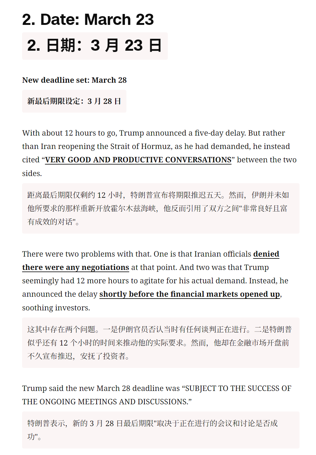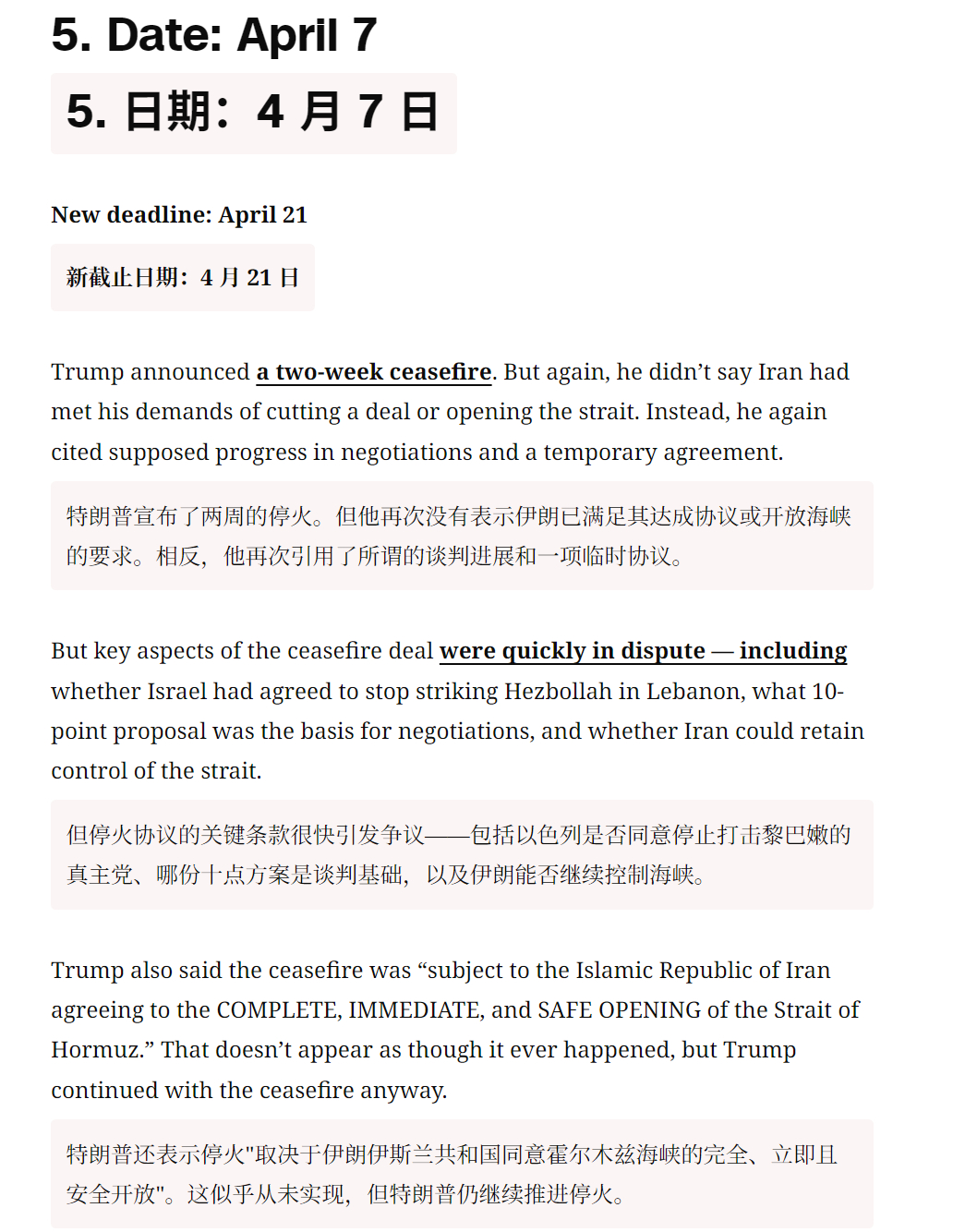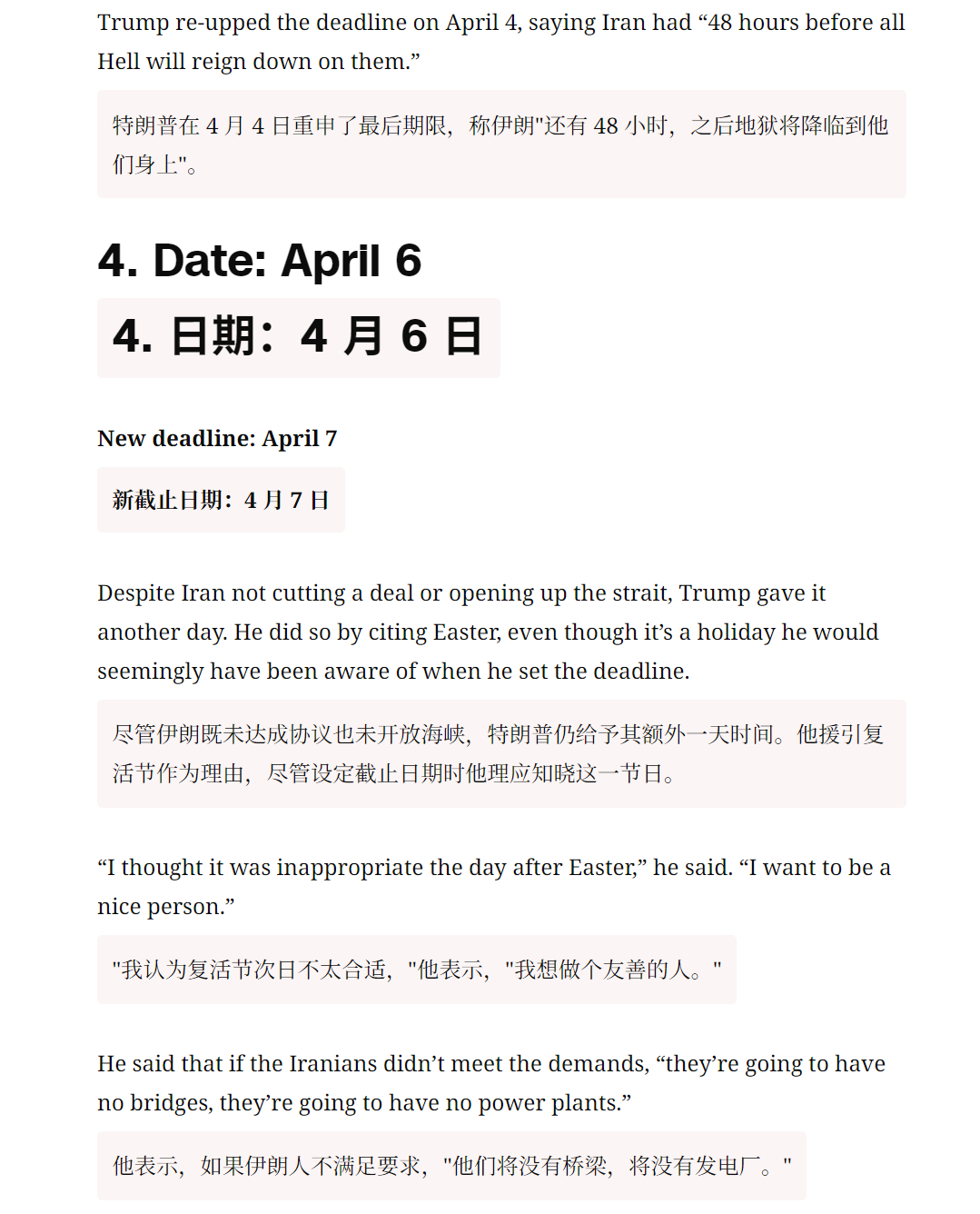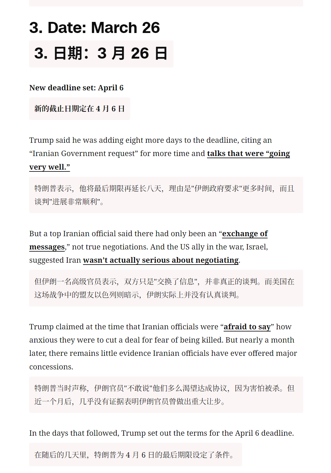 🔻CNN:特朗普对伊朗虚张声势的意义。🔻在伊朗战争爆发的第五天,3 月 4 日,白宫新闻秘书卡罗琳·莱维特向美国敌人发出挑衅性信息,“特朗普总统从不虚张声势。”🔻CNN 称,鉴于特朗普在俄乌战争中屡次发出空洞威胁并错过最后期限的前科,这番表态本身已值得怀疑。🔻过去五周,或许比特朗普总统两届任期中的任何时期都更清楚地揭示了他作为虚张声势者的本质——而且是在一个可以想象的最大、最重要的舞台上。🔻特朗普已六次分别设定最后期限,要求伊朗接受他的条件,否则将面临他的愤怒。🔻而每一次,尽管几乎没有或完全没有公开证据表明伊朗满足了他提出的条件,他还是推迟了最后期限。特朗普“TACO”了的说法已成为批评者的笑柄。但这并不好笑。正如曾因巴拉克·奥巴马未能执行其叙利亚红线而猛烈抨击他的特朗普会告诉你的那样,虚张声势被揭穿会带来真正的代价——无论是对于美国的信誉还是力量的展示。🔻然后 CNN 逐一列举了特朗普的六次最后通牒:🔹1. 日期:3 月 21 日,最后期限设定:3 月 23 日,特朗普表示,伊朗必须在“48 小时内,毫无威胁地全面开放霍尔木兹海峡”。否则,美国将开始打击其发电厂。🔹2. 日期:3 月 23 日,新最后期限设定:3 月 28 日,距离最后期限仅剩约 12 小时,特朗普宣布将期限推迟五天。然而,伊朗并未如他所要求的那样重新开放霍尔木兹海峡,他反而引用了双方之间“非常良好且富有成效的对话”。🔹3. 日期:3 月 26 日,新的截止日期定在 4 月 6 日,特朗普表示,他将最后期限再延长八天,理由是“伊朗政府要求”更多时间,而且谈判“进展非常顺利”。但伊朗一名高级官员表示,双方只是“交换了信息”,并非真正的谈判。而美国在这场战争中的盟友以色列则暗示,伊朗实际上并没有认真谈判。🔹在随后的几天里,特朗普为 4 月 6 日的最后期限设定了条件。他的要求是“达成一项协议”,并且霍尔木兹海峡必须“立即'开放营业'”。如果未能实现,他将炸毁伊朗所有的发电厂、油井和哈尔克岛,甚至可能包括该国所有的海水淡化厂。(特朗普在此威胁的举动很可能构成战争罪。)他后来补充说,如果霍尔木兹海峡“开放、自由且畅通”,他将“考虑”停火。🔹特朗普在 4 月 4 日重申了最后期限,称伊朗“还有 48 小时,之后地狱将降临到他们身上”。🔹4. 日期:4 月 6 日,新截止日期:4 月 7 日,尽管伊朗既未达成协议也未开放海峡,特朗普仍给予其额外一天时间。他援引复活节作为理由,尽管设定截止日期时他理应知晓这一节日。“我认为复活节次日不太合适,”他表示,“我想做个友善的人”。他表示,如果伊朗人不满足要求,“他们将没有桥梁,将没有发电厂。”🔹5. 日期:4 月 7 日,新截止日期:4 月 21 日,特朗普宣布了两周的停火。但他再次没有表示伊朗已满足其达成协议或开放海峡的要求。相反,他再次引用了所谓的谈判进展和一项临时协议。特朗普还表示停火“取决于伊朗伊斯兰共和国同意霍尔木兹海峡的完全、立即且安全开放”。这似乎从未实现,但特朗普仍继续推进停火。🔹6. 日期:4 月 21 日,新期限:未明确,特朗普宣布将给予伊朗一个未明确期限的延期,以提出和平方案。但德黑兰再次未能如他所要求的那样达成协议或开放海峡。🔹这一次,他甚至没有提及所谓的进展。🔹相反,特朗普引用了“伊朗政府严重分裂的事实”。但随后他在下一句话中削弱了自己的推理,称领导层分裂“并不意外”。如果这是可预见的,那为何之前要设定强硬期限?🔹消息人士告诉 CNN,特朗普打算将新的延长期限设定为有限时间,但白宫周三晚些时候表示,他并未设定“固定期限”。🔻“人们说我想在中期选举前结束战争,这不是真的,”特朗普周三对福克斯新闻的玛莎·麦卡勒姆表示,并称结束这场战争“没有时间表”。🔻你完全可以理解伊朗为何会得出结论,认为特朗普根本不想兑现他的威胁。毕竟,尽管几乎没有公开证据表明德黑兰满足了他的红线条件,他还是延长了停火期限。🔻在 2016 年共和党全国代表大会的演讲中,特朗普将奥巴马的“红线”称为“耻辱”,因为“全世界都知道这毫无意义”。🔻那特朗普的红线又在哪里?🔻特朗普又要骂CNN了。伊朗将恢复往返中国航班特朗普抽身却被伊朗拖住海外新鲜事中东现场直击