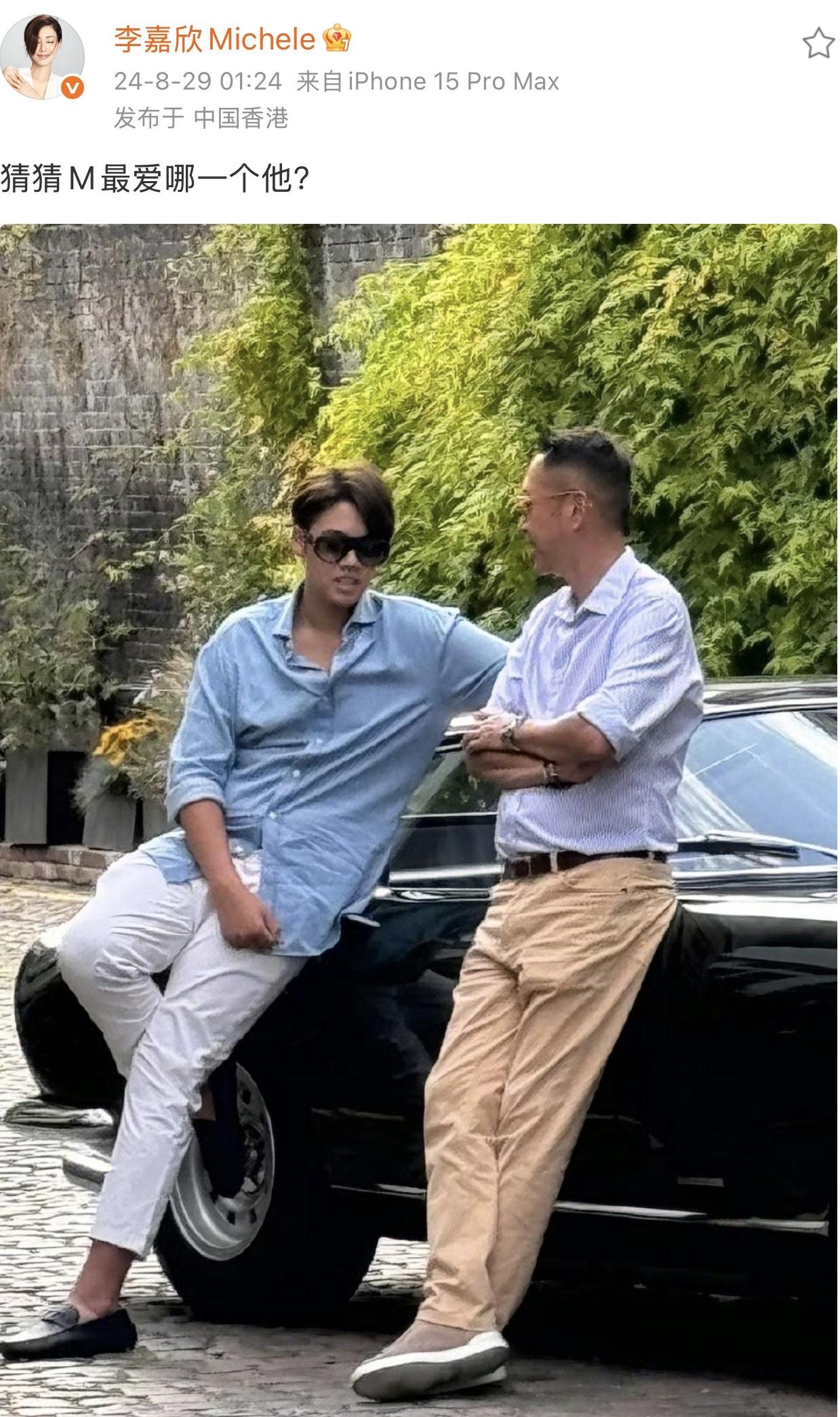 当时,李嘉欣晒出父子俩在车旁聊天的画面,还配文:“猜猜M最爱哪一个他?”。