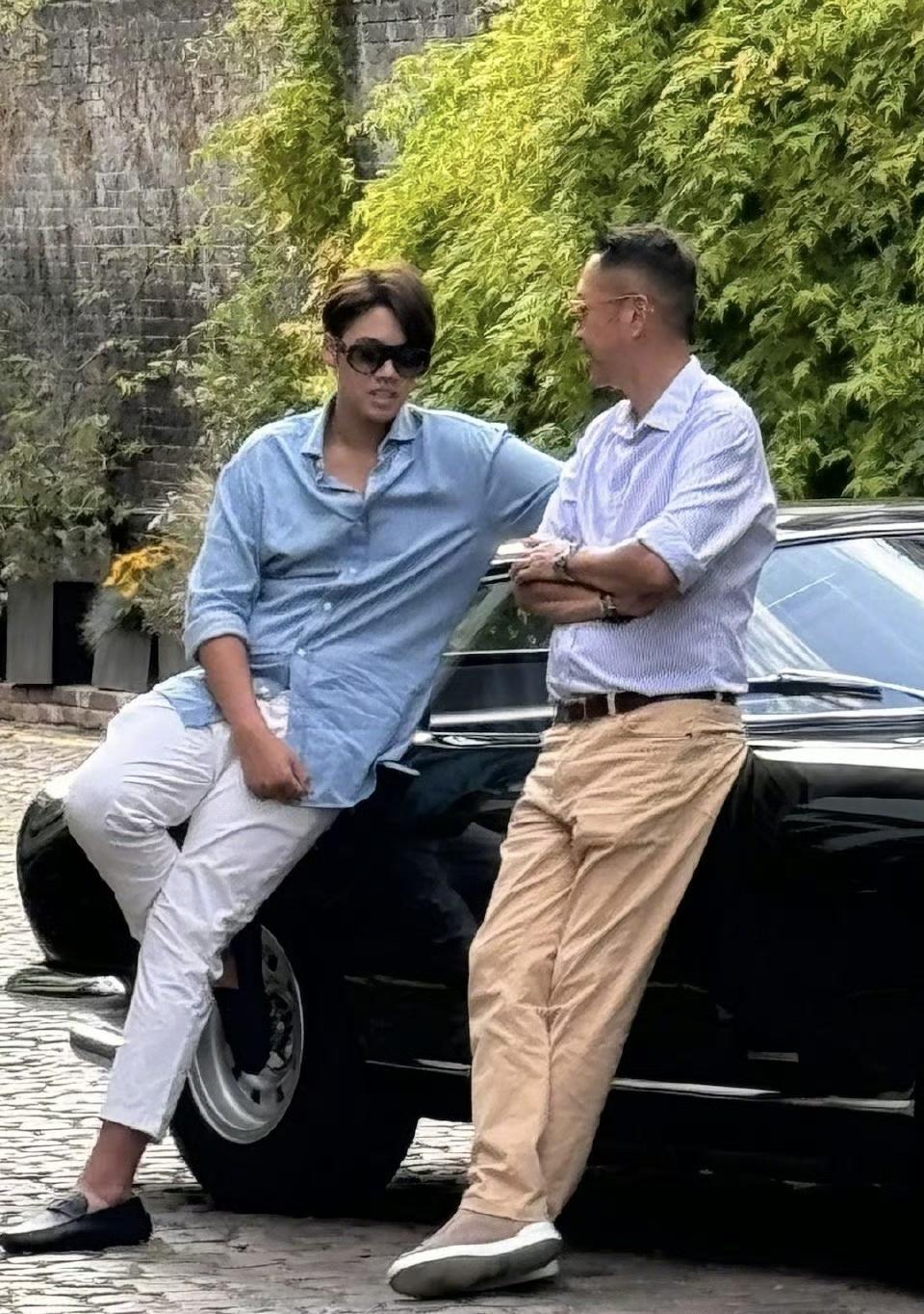 李嘉欣的儿子许建彤,也是越长大越高大帅气了,他戴着墨镜,依靠在车旁,很有富家公子的气质。李嘉欣