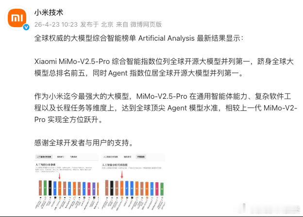 说实话现在再看小米,早就不能只用手机厂商的眼光去看待了。这次小米首次登顶全球开源大模型第一 就是国产AI最好的证明。