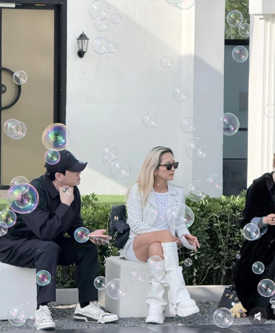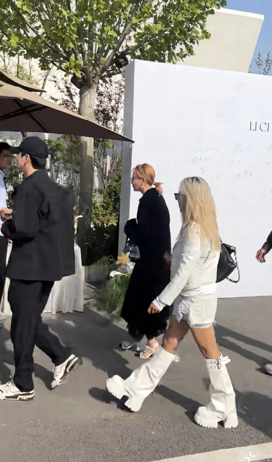 这次她来参加朋友的婚礼染了一头黄毛,穿了白色的衣服,脚上是一双白色的高筒厚底靴子,看着好热。
