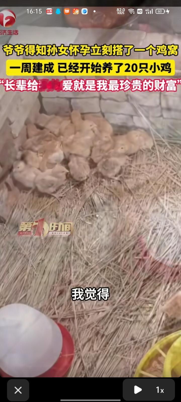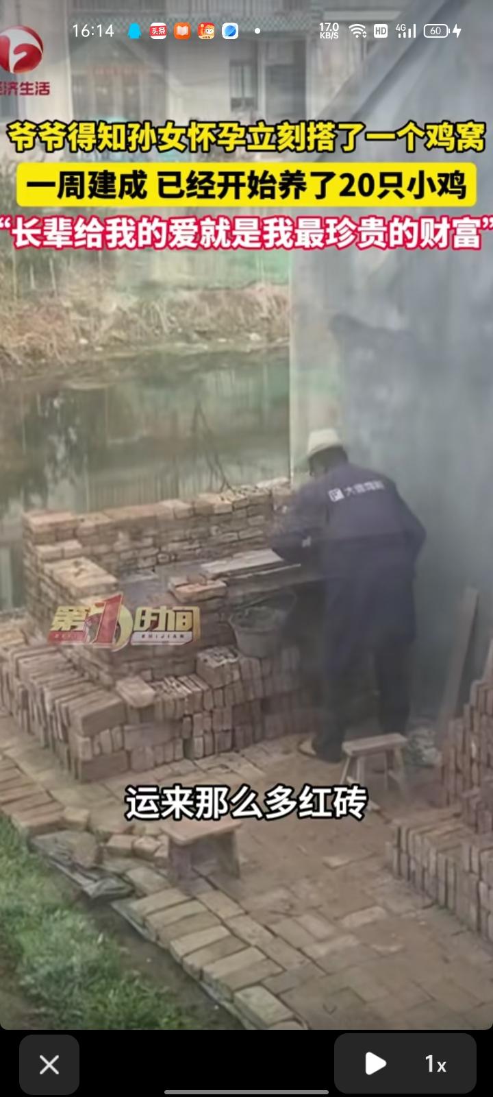 4月20日,南通市如东县。顾女士称,今年年初怀孕,就把这消息告诉爷爷奶奶,没想到第二天,爷爷奶奶不知从哪弄这么多红砖,就开始砌鸡窝,前前后后花了一周时间建成,砌的非常标准和豪华。现在抓了20只小鸡开始养,觉得长辈给我的爱是我的最珍贵的财富。