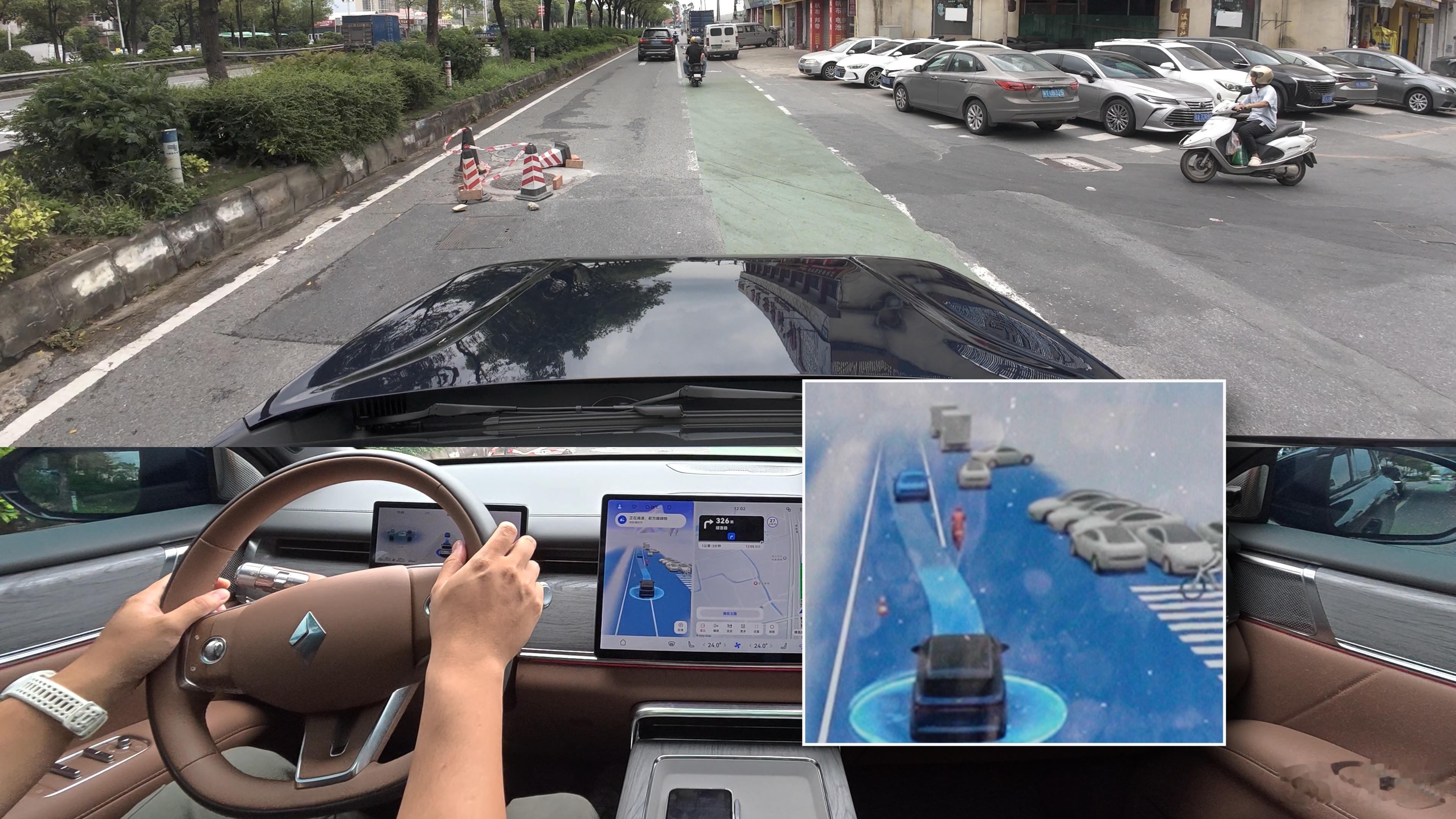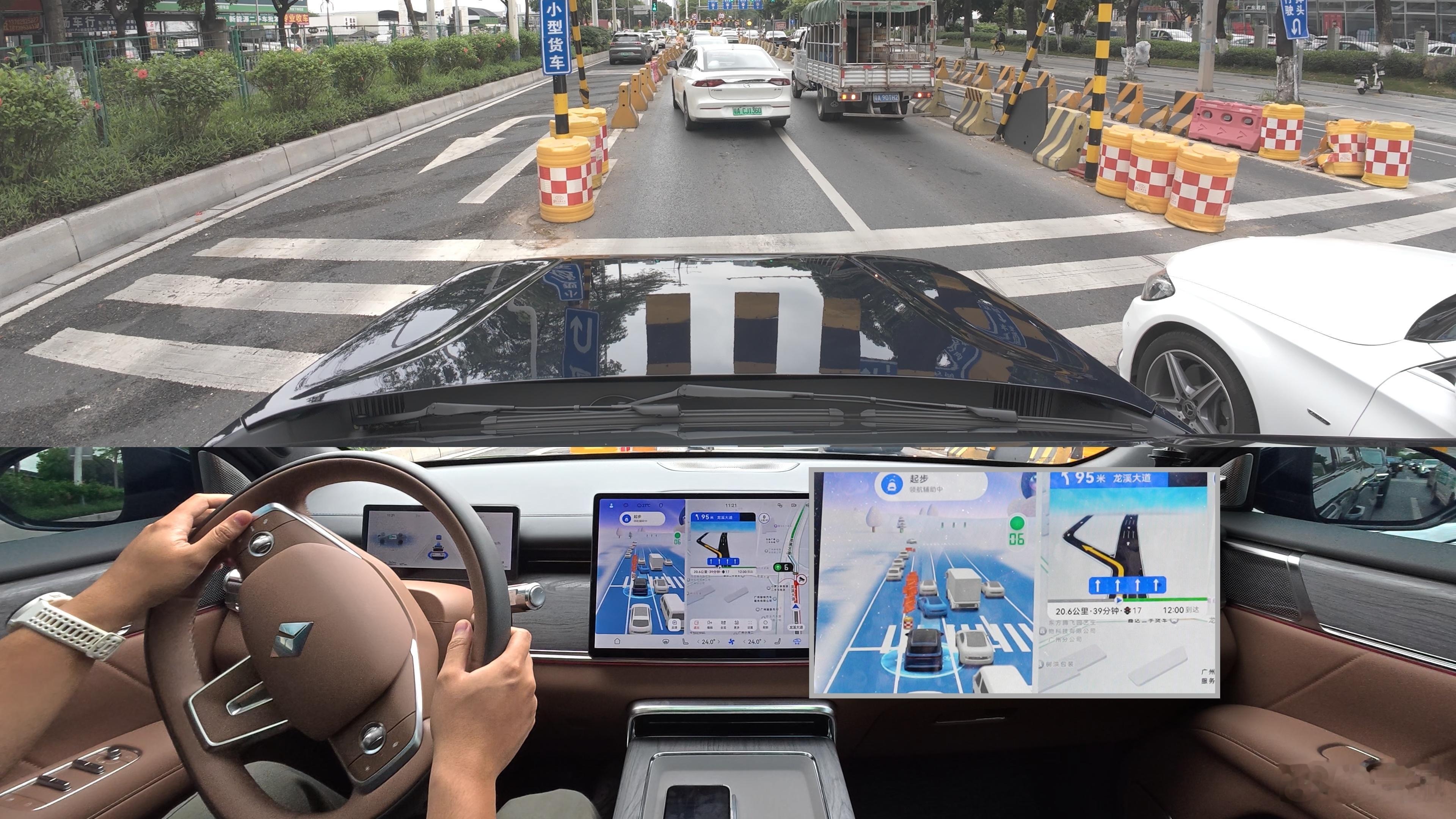 2、博弈胆大心细。华境S搭载的是ADS V4.1.5版本,在复杂场景下,它的信息融合判断既快也准,比如多车道合并双车道,前方还有货车倒车这种场景,它也无惧周边肉搏加塞,跟着车流慢慢通行,这点挺让人意外。变道超车对于安全距离的判断也很精准,旁边车道有慢车,前方有占道车,它会选择先超慢车再绕行。
