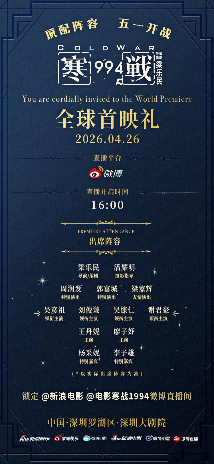 电影寒战1994全球首映礼 将于4月26日高能来袭!周润发、梁家辉、郭富城、吴彦祖、刘俊谦、吴慷仁、谢君豪、王丹妮、廖子妤等豪华阵容已就位,欢迎当日16点锁定下方直播间前排围观为了给红毯加点“猛料”,寒战1994首映礼整活部门招聘 即日发车:各位“策划官”前往寒战,带话题发布你为某位主创定制红毯互动,只要你的整活创意被选中,TA就会在红毯现场“接单”执行!