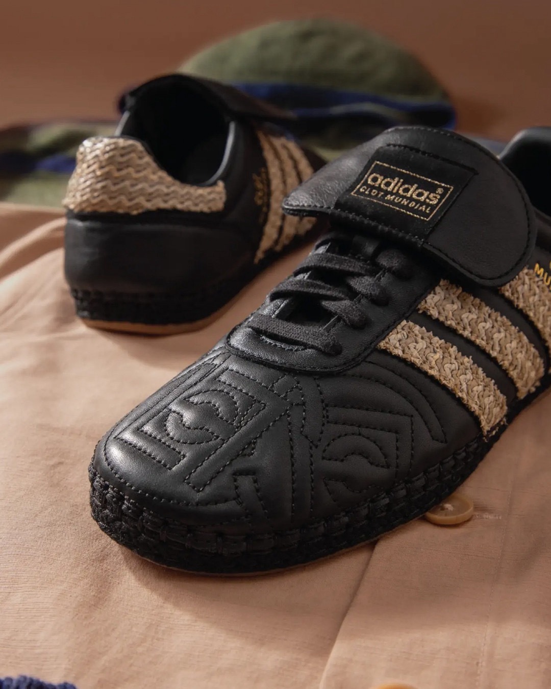 CLOT x adidas Originals Mundial 联名系列现已登场。鞋款方面,核心的 CLOT Mundial 以高级皮革搭配拉菲草质三条纹与草编鞋底,另一款 CLOT Samba 则融合了麂皮鞋头与拉菲草底。服饰部分则围绕 Teamgeist 针织球衣展开,并辅以复古印花短裤、Baja 连帽衫以及工装短袖衬衫。