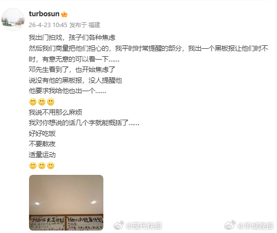 #孙俪一家除了她都焦虑了#【#孙俪用12个字回应邓超的焦虑#】4月23日,孙俪发文称,每次出门拍戏前,孩子们都很焦虑,于是她做了黑板报让孩子们有意无意地看一下。看到后说他也焦虑了,要求也给他做一个黑板报,于是孙俪用12个字回应:好好吃饭,不要熬夜,适量运动。(现代快报)更多消息:#刘宇宁否认与宋祖儿恋情##朴宝剑张元英 演员脸和爱豆脸##曝李卿恋爱##曝黄一鸣出轨##神仙肉 AI配角##唐艺昕袜子都跳破了#(编辑:杨雨桐;审签:艾渝)