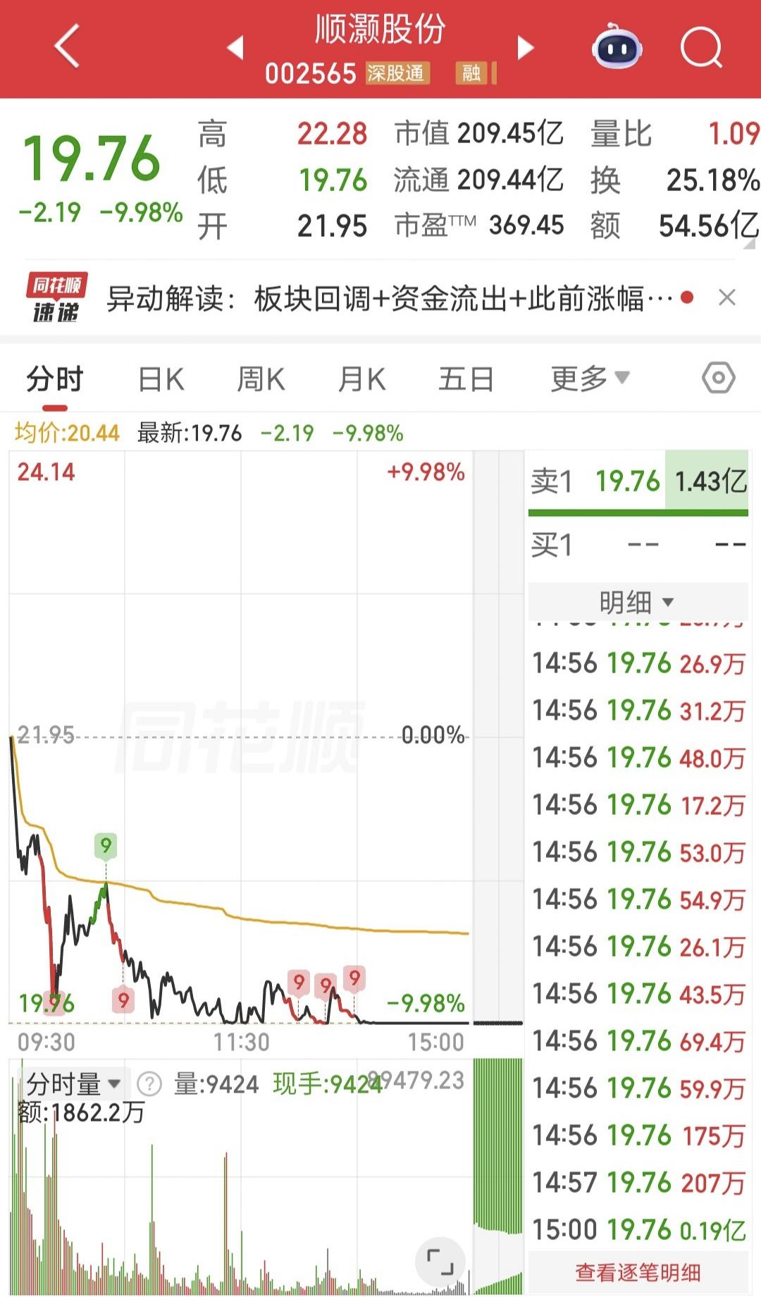 余哥怒砸1.3个亿! 今天跌停家数高达30家,顺灏股份开盘就一路走低最终跌停。