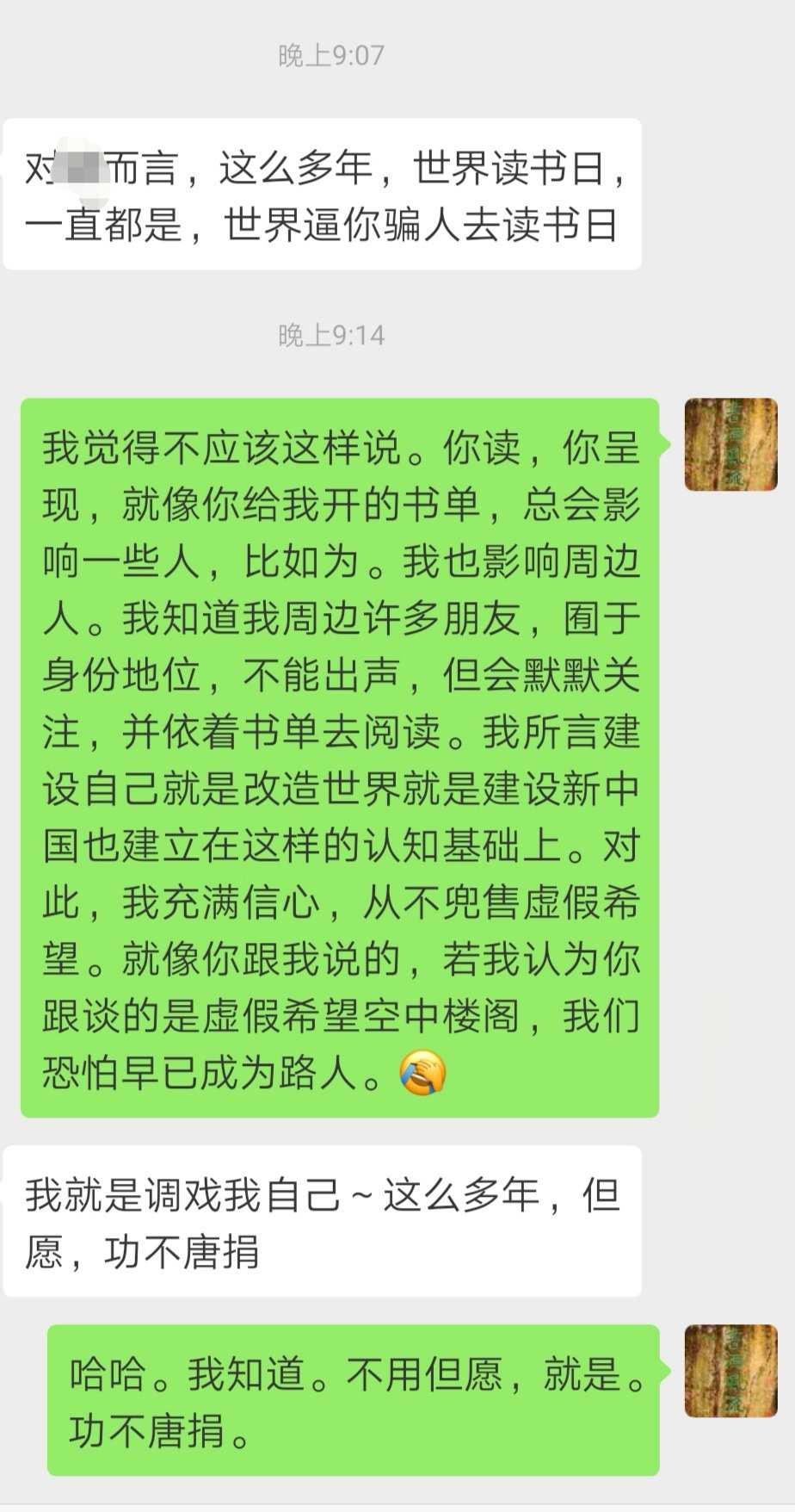 晚上偶尔翻到两段私人对话,都与读书相关。这也是分享读书的意义。