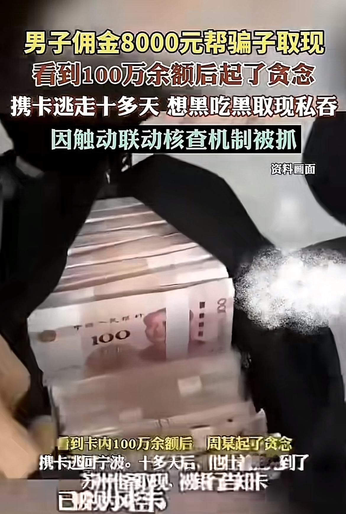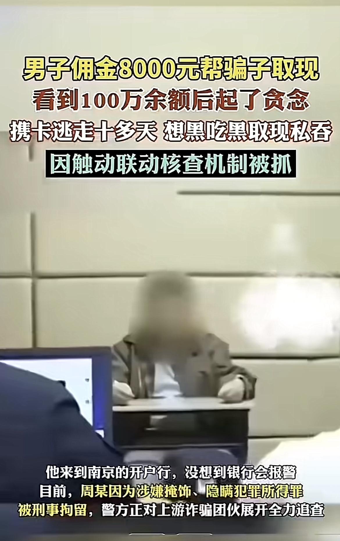 还有周某,本是诈骗链条下游取手,看到兼职招聘就加入。拿到卡发现有100万,立马起了贪念携卡逃走。十多天后去取现,结果卡成了风控卡,到南京开户行解封时被银行报警。他以为能白捡这100万,却不知法网恢恢。帮骗子取现本就是犯罪,还想私吞,这下好了,涉嫌掩饰、隐瞒犯罪所得罪被刑拘,真是“偷鸡不成蚀把米”。