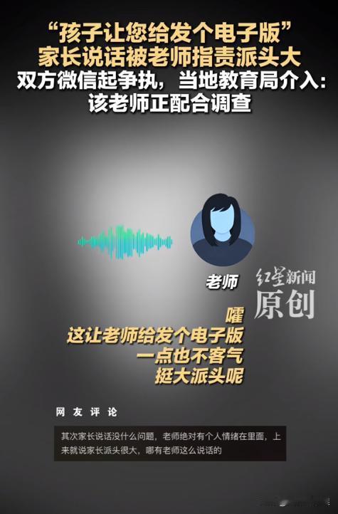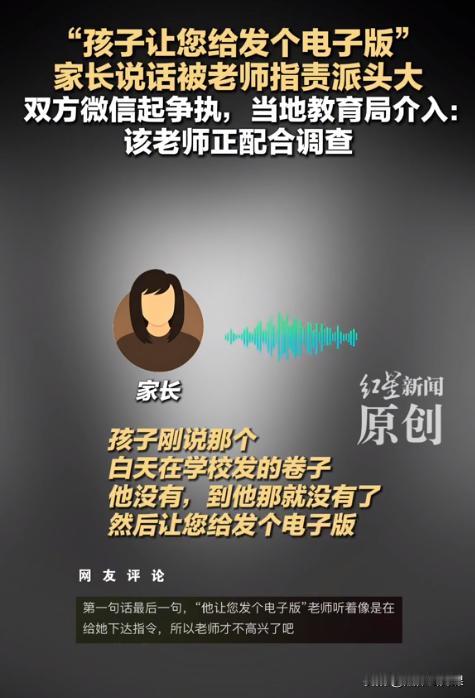 “是谁派头大?”天津,一位家长在晚上7点发语音向老师求试卷电子版,称自家孩子白天未领到。可老师却怒斥家长“派头大”、“不懂客气”,甚至还质问家长是不是把老师当服务员了。家长见老师有误会,立即解释说学校漏发了,可老师却没好气地怒怼了一句“下班了”。家长被老师这么一顿指责,也来了火气,认为老师才派头大,于是向教育部门进行了投诉,这下老师惨了。