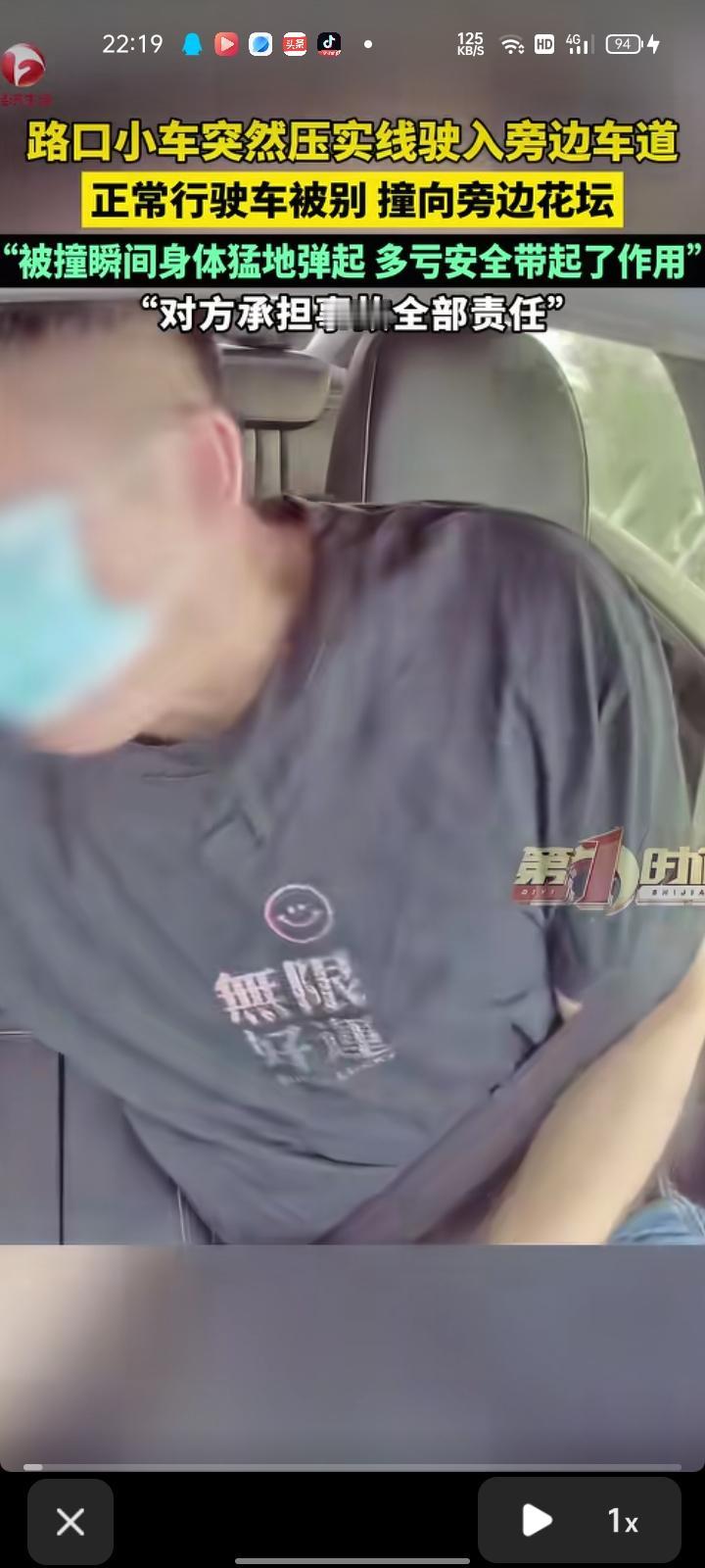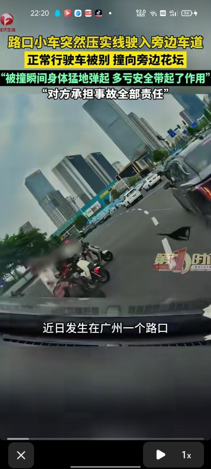4月19日,广东广州。司机张先生称,当时他在路口排队左转时,看见一辆车试图插队。从左起第三个车道插入第二个车道,前面的车掉头后拉开一些距离,他正常加速行驶,黑车突然驶入他的车道,根本没有刹车的机会,被他一别,顺势上了旁边的花坛,被撞瞬间一秒内身体弹起,是安全带起了作用。庆幸当时有花坛挡住了车,没有伤及到路人,但他的腰部和颈部在事故中挫伤,对方将承担事故全部责任