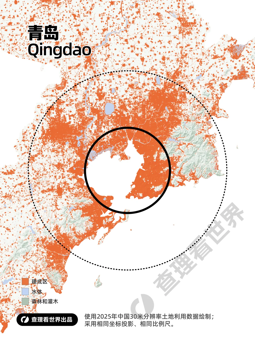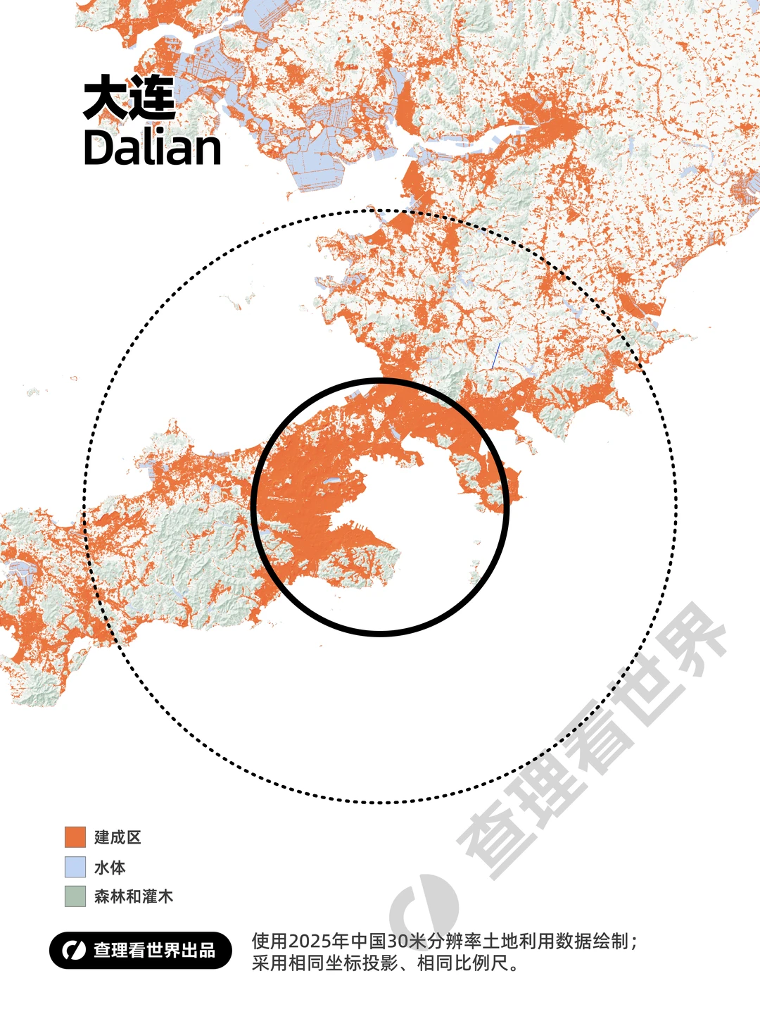 本组地图基于 2025 年全国 30 米分辨率土地利用栅格数据绘制,采用统一地图投影与相同比例尺,以完全一致的制图标准,客观评估天津、大连、青岛三座北方重要港口城市的建成区规模、空间形态与土地利用现状。同步配备同尺度北京对照底图,通过直观可视化对比,清晰呈现环渤海经济圈三大核心城市与全国标杆城市在空间格局、城区拓展尺度上的差异,为观察北方沿海城市群发展格局提供严谨的可视化参考。