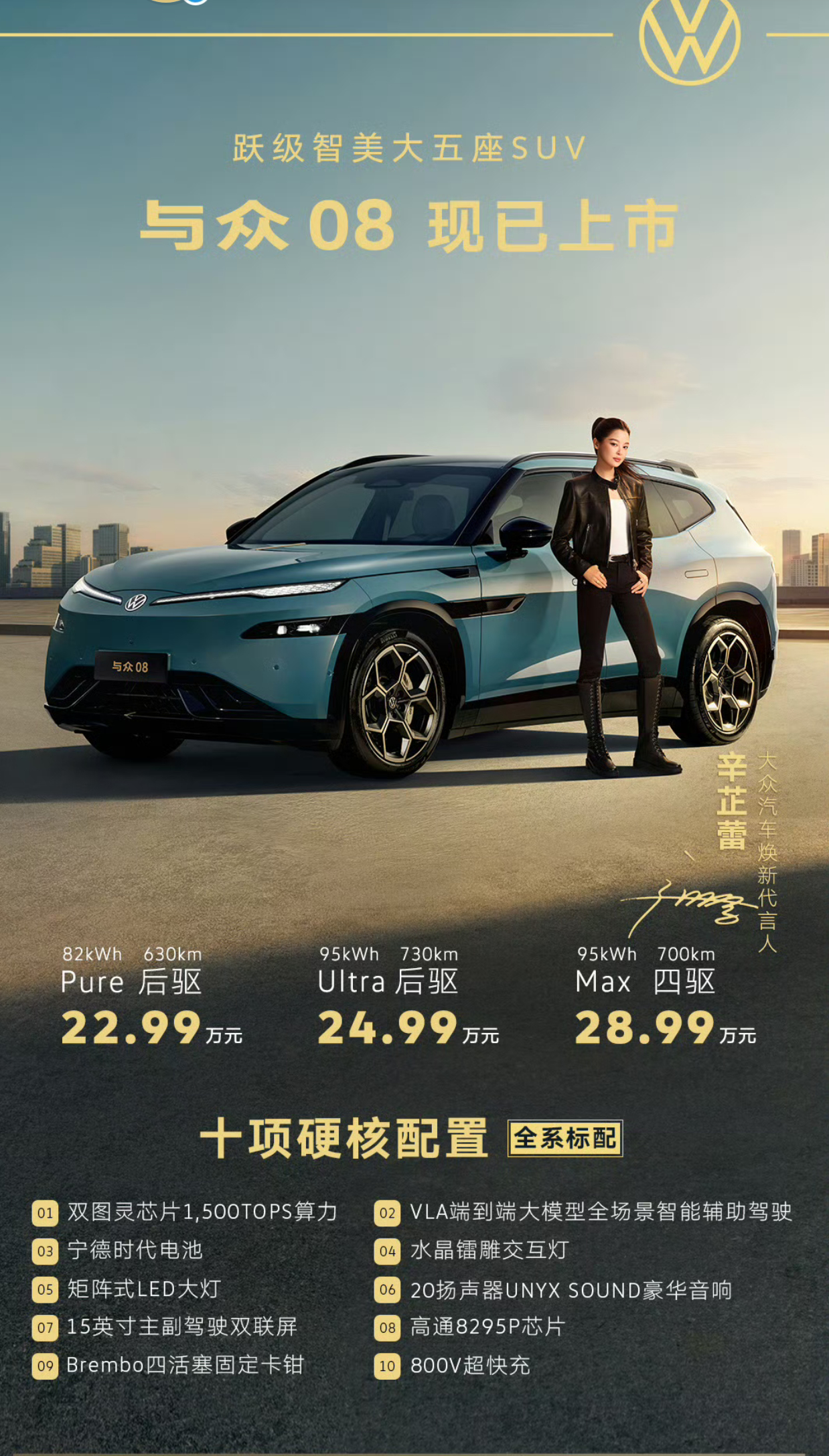 辛芷蕾代言大众含金量飙升大众智能纯电新势力 与众08上市起售价22.99万起