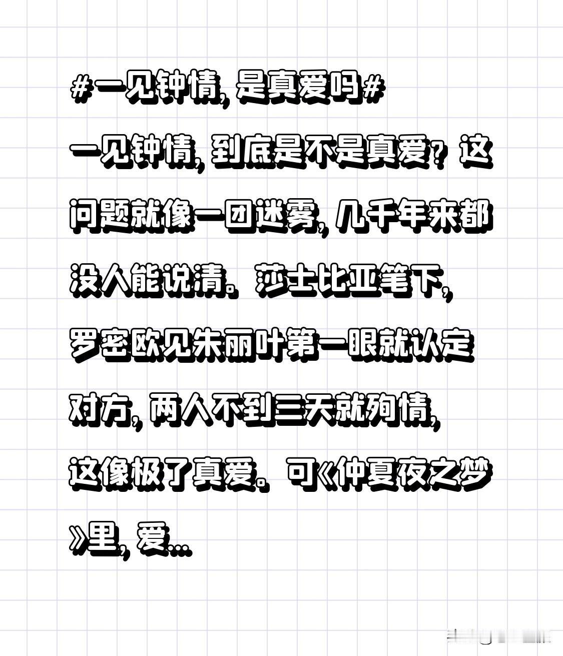 莎士比亚笔下,罗密欧见朱丽叶第一眼就认定对方,两人不到三天就殉情,这像极了真爱。可《仲夏夜之梦》里,爱情花汁能让拉山德瞬间变心,又让人怀疑一见钟情的可靠性。