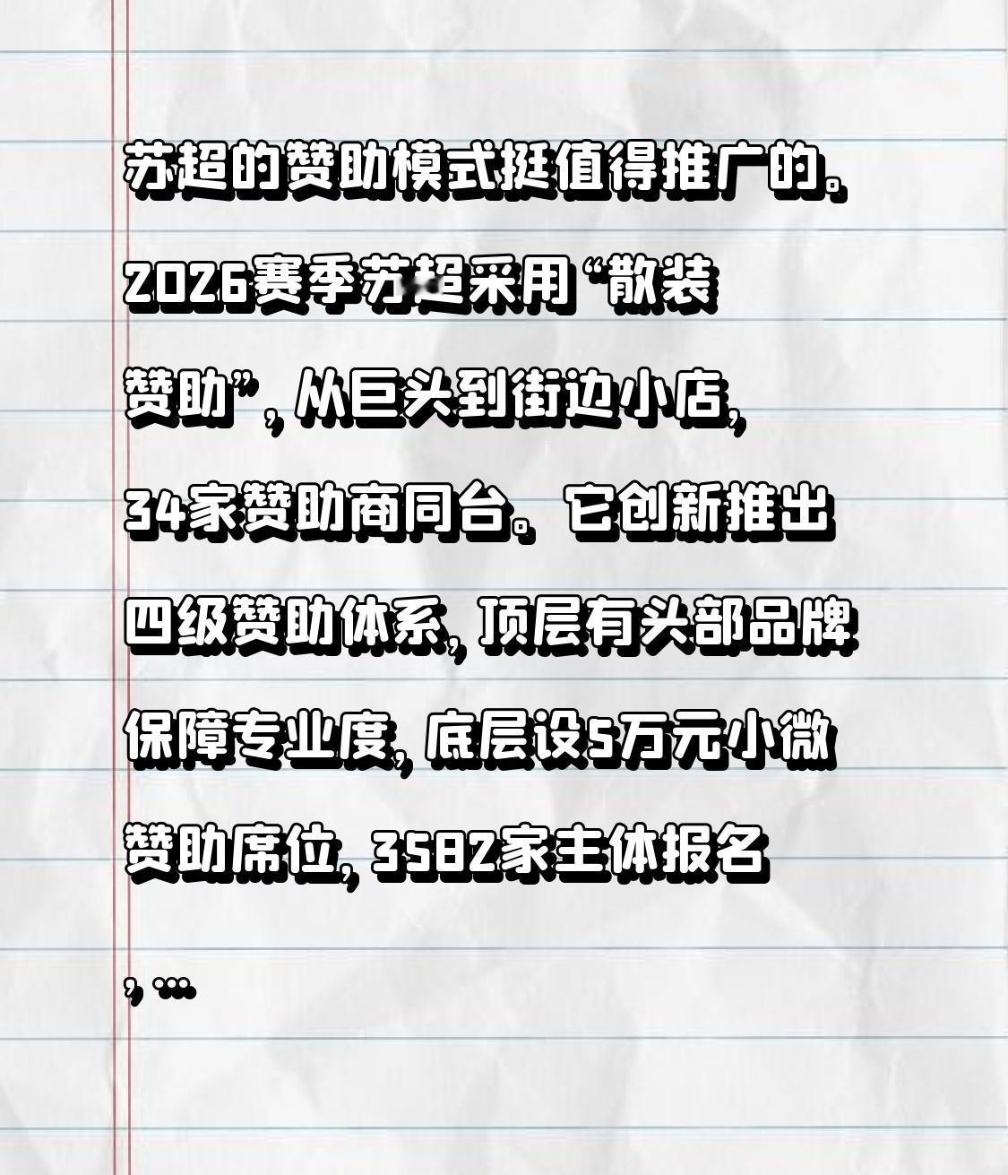 苏超的赞助模式挺值得推广的。202赛季苏超采用“散装赞助”,从巨头到街边小店,3