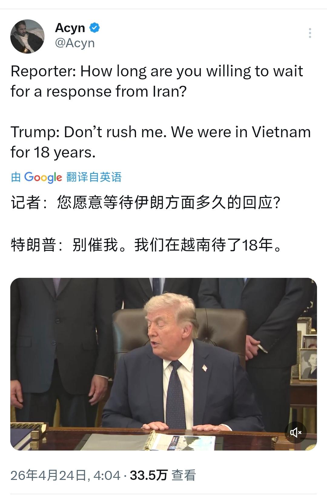 [机智]评几句:从“一次小旅行”到“别催我。我们在越南待了18年。”特朗普的话术尽显荒诞与双标,拿越南作喻搪塞美伊谈判僵局,却忘了自己当年为躲越战五次逃兵役,如今竟厚着脸皮拿“待18年”标榜耐心,何其讽刺。特朗普一边宣称对伊谈判“不仓促”,一边又高调喊着“彻底封锁”霍尔木兹海峡、保留军事选项,嘴上装着从容,行动上满是霸权式施压。伊朗早已戳穿其虚伪,美方的封锁与威胁本就是谈判最大障碍,特朗普的拖延不过是为谈判失利找借口,用无厘头的类比掩盖自身战略的混乱,这般前后矛盾的表演,终究骗不过国际社会,也解不开自己亲手制造的中东困局。