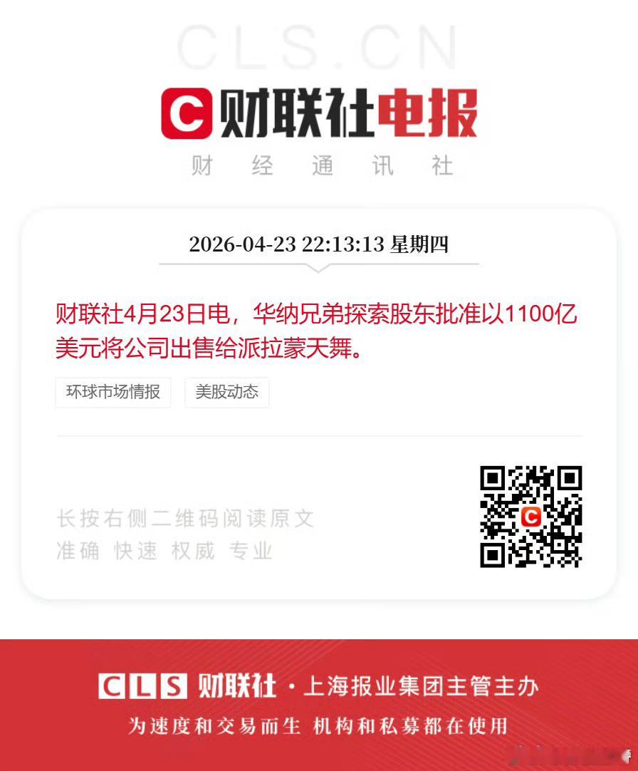 华纳兄弟1100亿美元卖给派拉蒙华纳兄弟探索(WBD)股东于4月23日投票通过派拉蒙的收购提案,赞成票呈压倒性多数,被双方视为完成交易的"关键里程碑"。不过,股东同时否决了WBD CEO大卫·扎斯拉夫因交易可能获得的5.5亿至8亿美元薪酬方案(该投票无法律约束力,扎斯拉夫仍可能获得补偿)。交易最终落地仍需通过美国司法部及欧盟反垄断审查,派拉蒙预计2026年第三季度完成合并。