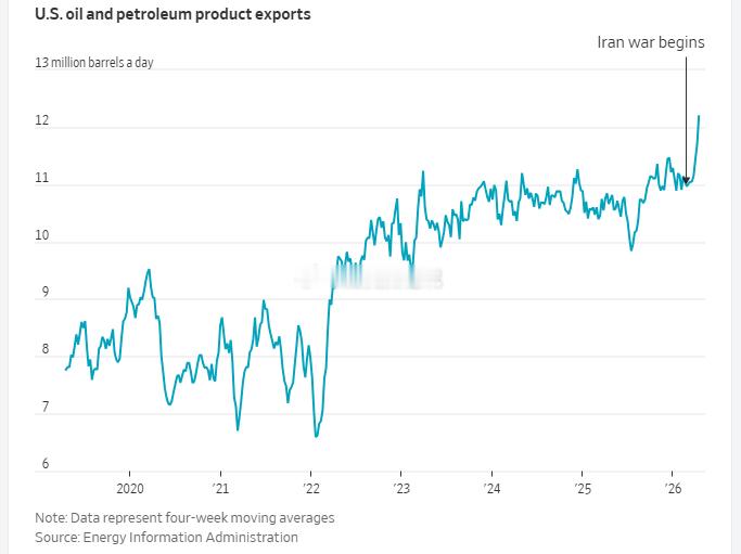 特朗普称美完全掌控霍尔木兹WSJ报道,美国正在以创纪录的规模向海外出口石油,填补伊朗战争引发的能源冲击所留下的供应缺口。根据美国能源信息署的数据,上周美国石油出口接近每日1290万桶。巨型油轮将原油、汽油、柴油、航空燃料、丙烷等运往海外。