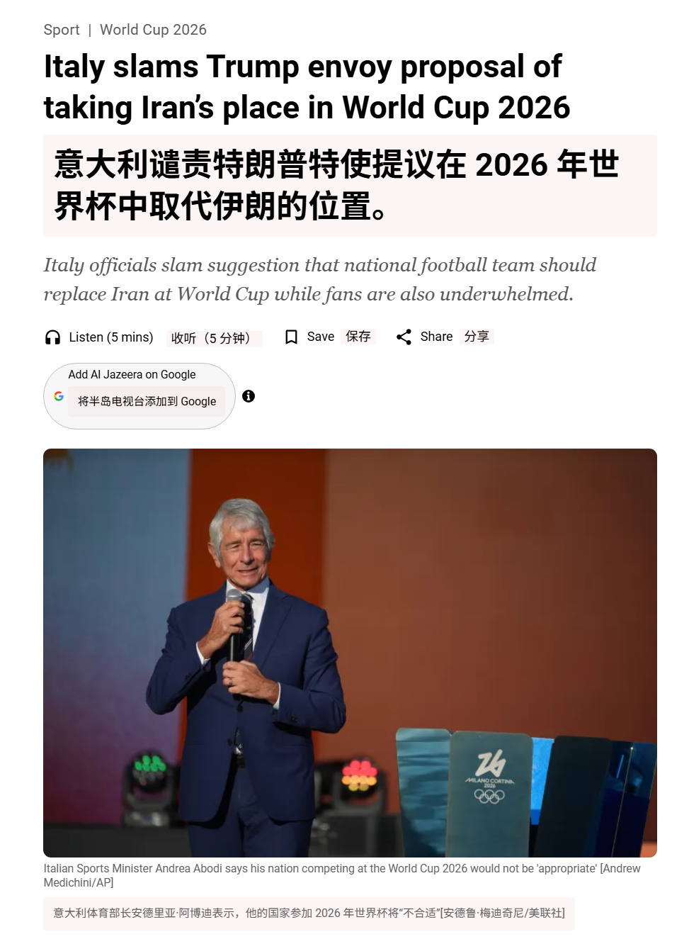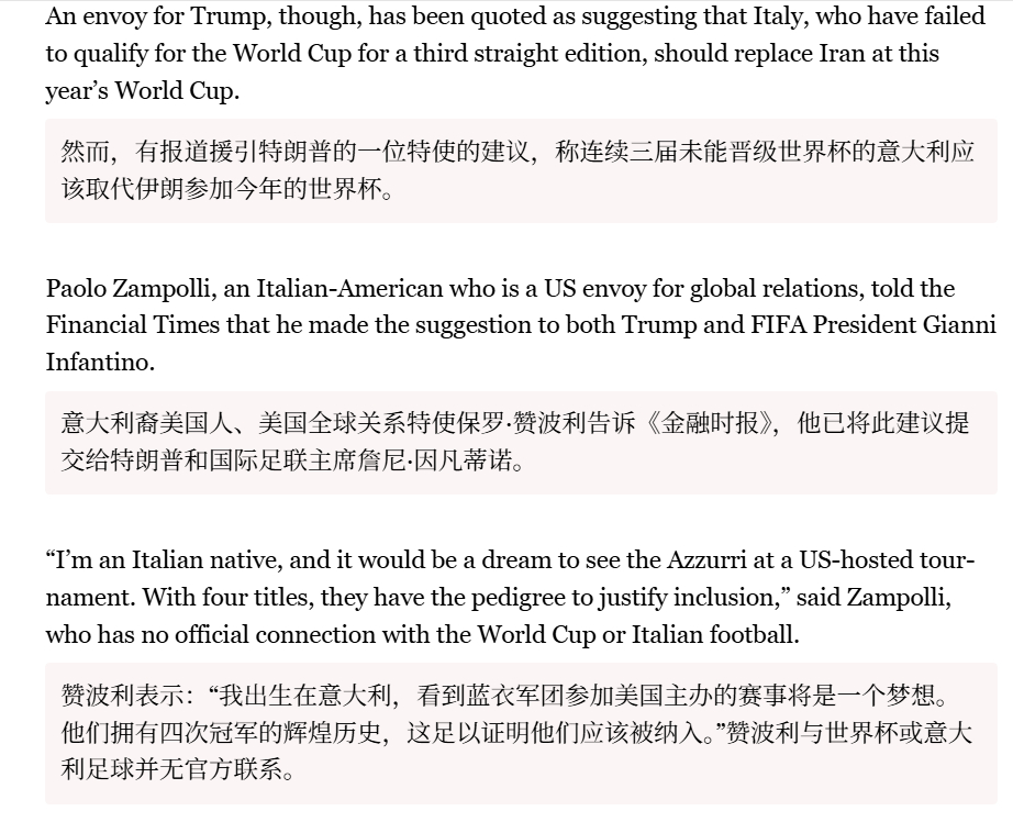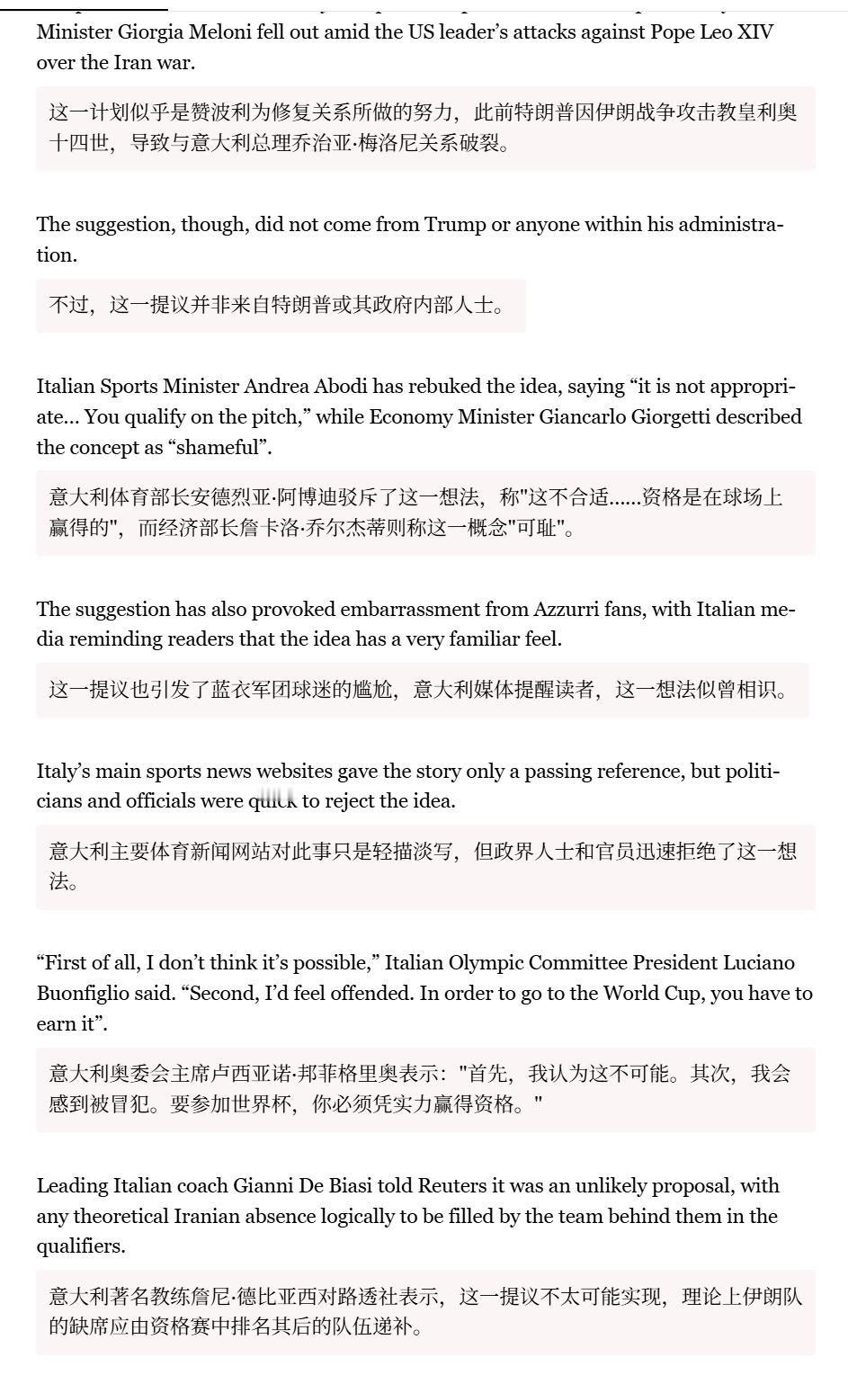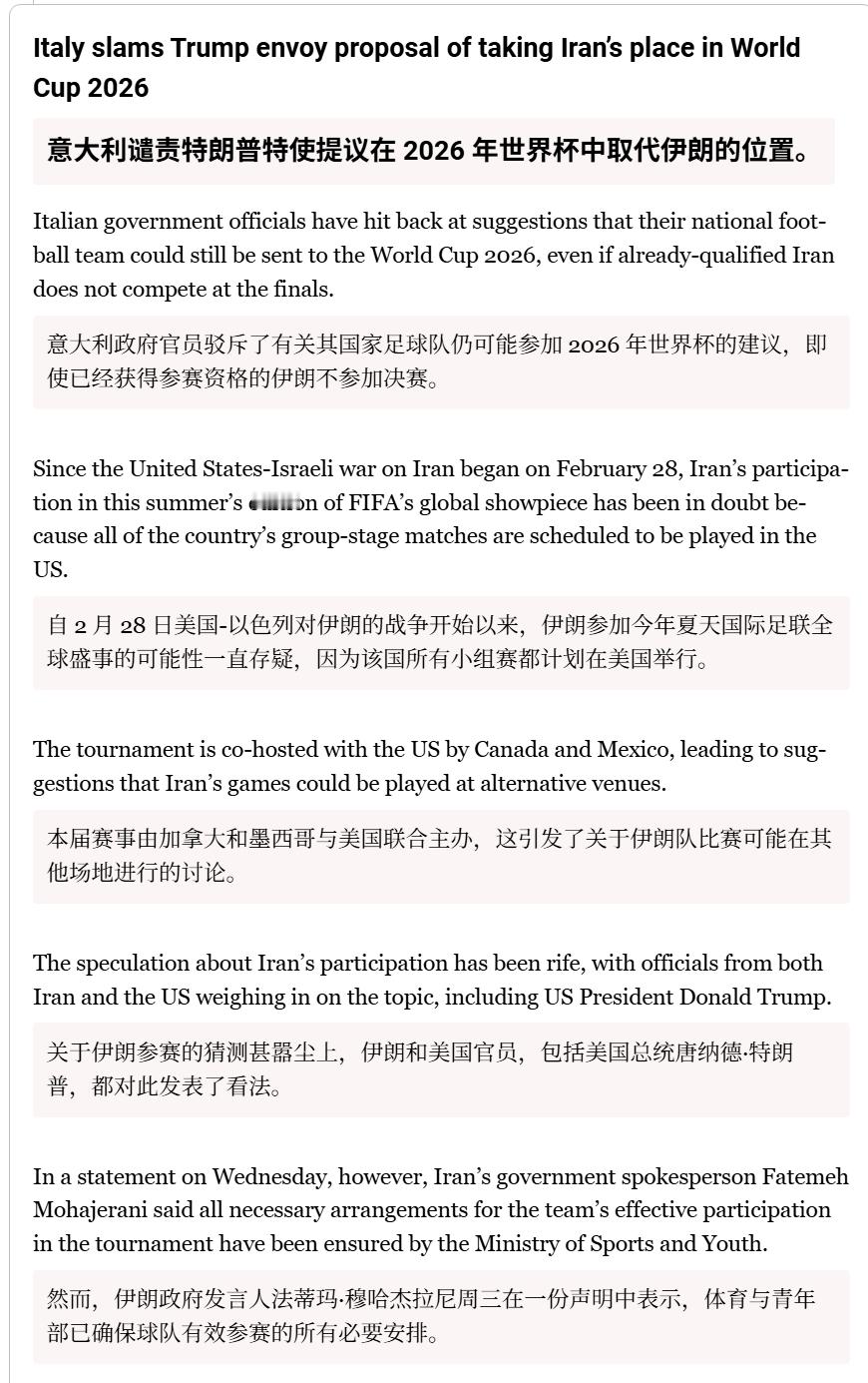 🔻意大利谴责特朗普特使提议“意大利在 2026 年世界杯中取代伊朗的位置”。🔻意大利体育部长安德烈亚·阿博迪驳斥了这一想法,称“这不合适……资格是在球场上赢得的”,而经济部长詹卡洛·乔尔杰蒂则称这一概念“可耻”。🔻意大利奥委会主席卢西亚诺·邦菲格里奥表示:“首先,我认为这不可能。其次,我会感到被冒犯。要参加世界杯,你必须凭实力赢得资格。”🔻美国真是把不要脸顶脑门上了,意大利足球但凡有点骨气能答应你这个?特朗普称美完全掌控霍尔木兹 海外新鲜事 中东现场直击 特朗普称下令击沉霍尔木兹布雷船