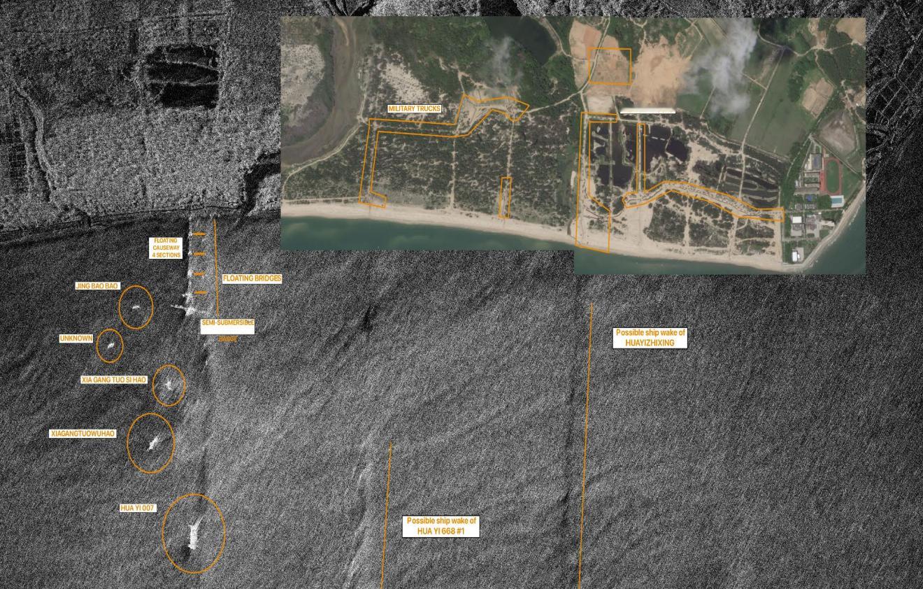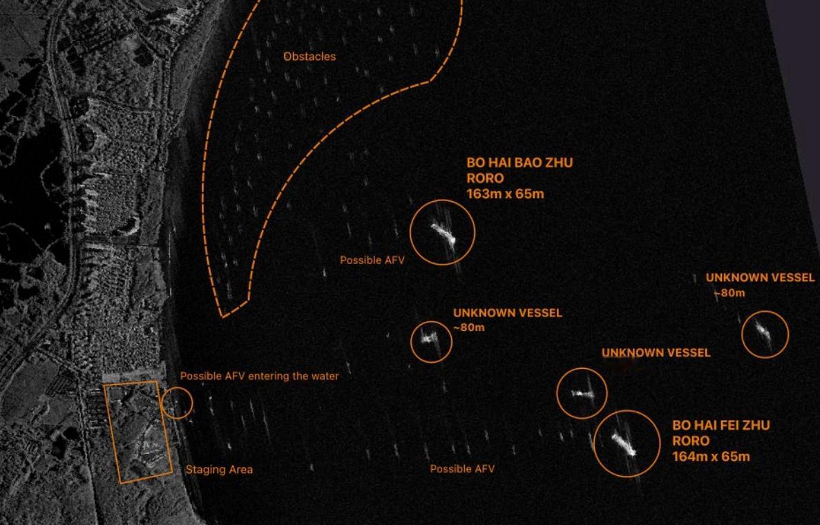坦克登陆艇(LCT)直接抢滩登陆这是解放军顶点两栖演习中首次被观测到 LCT 直接抵滩卸载兵力,6 艘 LCT 分两批次完成直接抢滩,单艇至少可搭载 20 台车辆,合计至少完成 120 台军用车辆的岸滩投送,卫星影像最终统计约 215 台车辆完成登陆。该能力填补了首轮突击夺滩与港口 / 浮式栈桥启用之间的后勤投送空白,可在夺滩初期快速完成兵力与装备的持续输送。