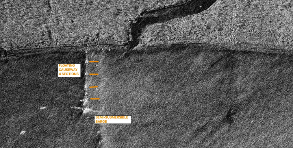 浮式栈桥系统部署与卸载本次部署的浮式栈桥由 4 段自航模块 + 1 艘半潜驳船组成,全长约 365 米,可适配深吃水滚装船的岸滩卸载需求,配套拖船全程保障,且参演舰艇在栈桥作业期间关闭了船舶自动识别系统(AIS),验证了隐蔽行动能力。演习首次观测到新型气垫艇参与栈桥保障作业,该艇为双发配置,尺寸小于现役 726/A 型气垫艇,也是首次被记录参与两栖演习。