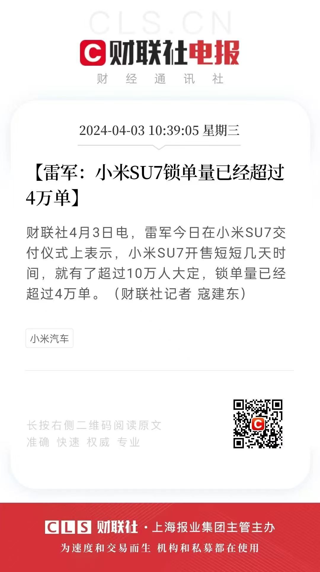 新一代小米 SU7锁单6万台(截止4/23),20天新增2万锁单,平均每天锁单1