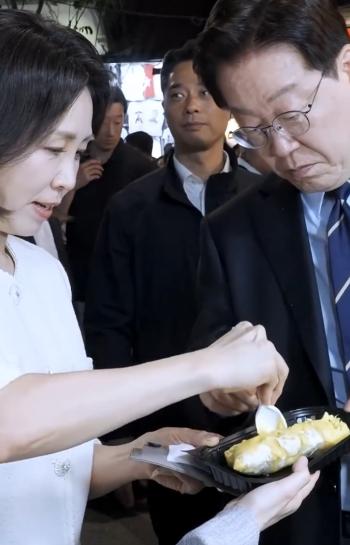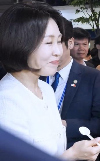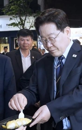 从镜头我们可以看出,李在明逛夜市的时候遇到越南的榴莲非常喜欢,随后打卡榴莲就是狂吃,从李在明的吃相可以让很多人隔着屏幕就流口水了。同时韩国夫人金惠景也品尝了这美味的榴莲,从两人的表情可以看出,这榴莲超级好吃。
