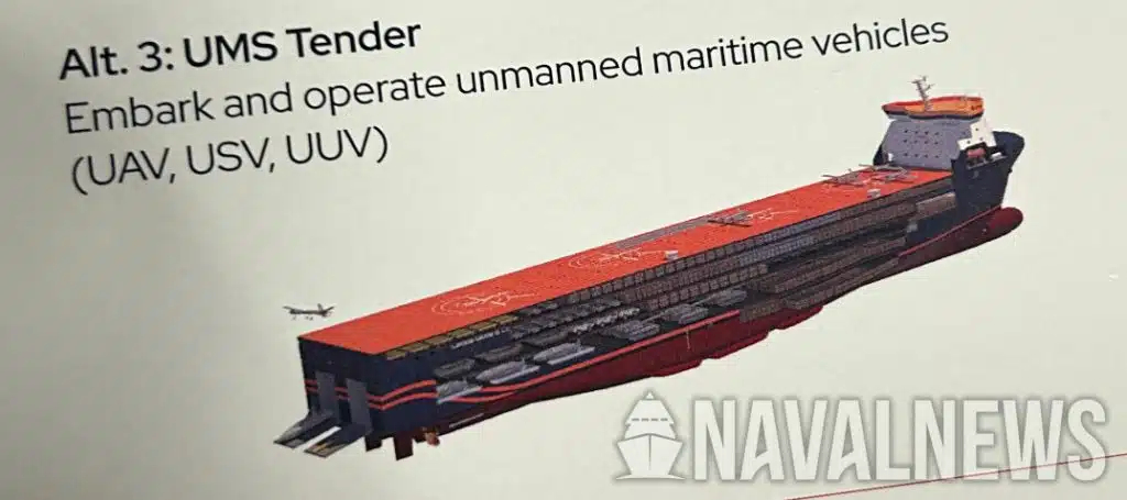 韩华和雷神吉布斯考克斯公司联合推出的一款军民两用快速支援舰设计,排水量达31000吨,用于运输任务时,可以一次搭载半个旅级战斗队的人员和装备;两栖登陆任务则还可以充当海上炮兵阵地,搭载自行火炮和海马斯对陆打击;还可以搭载MK70集装箱垂发,变身武库舰;也可以搭载海空无人装备,变身无人系统母舰。和我国发展的海洋共同体舰(图5)概念类似。