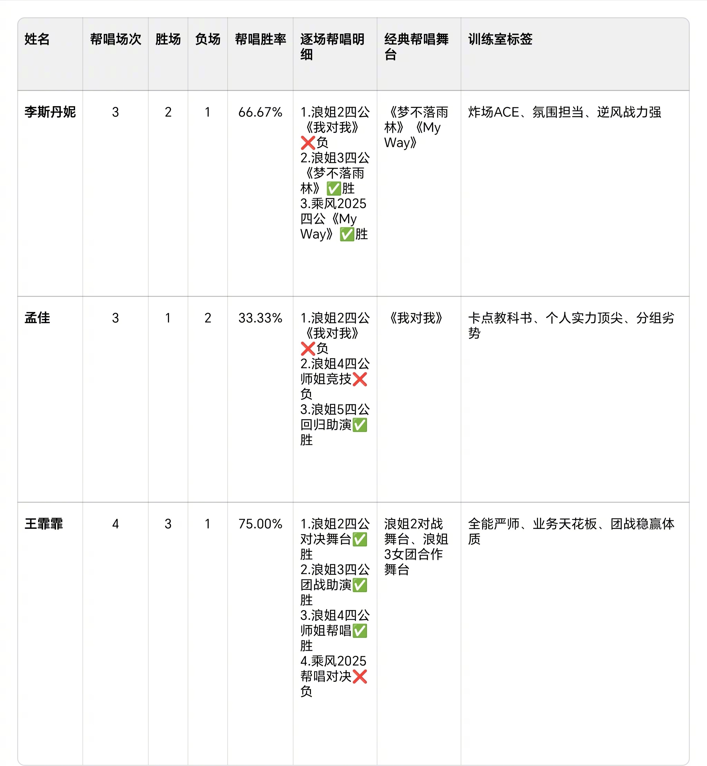 李斯丹妮孟佳王霏霏浪姐三公合体查了一下战绩:李斯丹妮帮唱胜率66.7%,浪姐1六轮五次第一。孟佳王霏霏训练室半小时速成舞台。三人合体=现场稳定度+舞蹈精度+舞台完成度全部拉满。直播无修音的三公,有这组在,至少音准和节奏不会崩。
