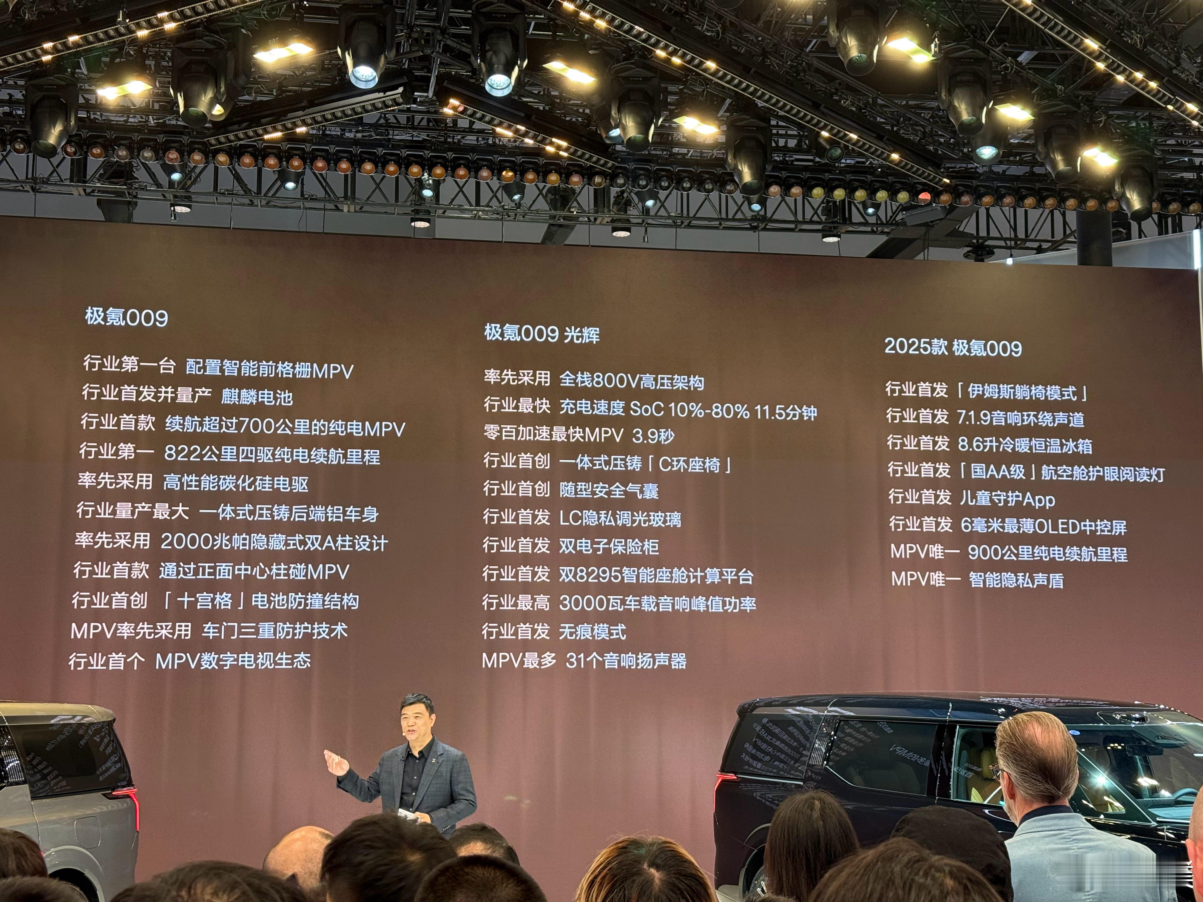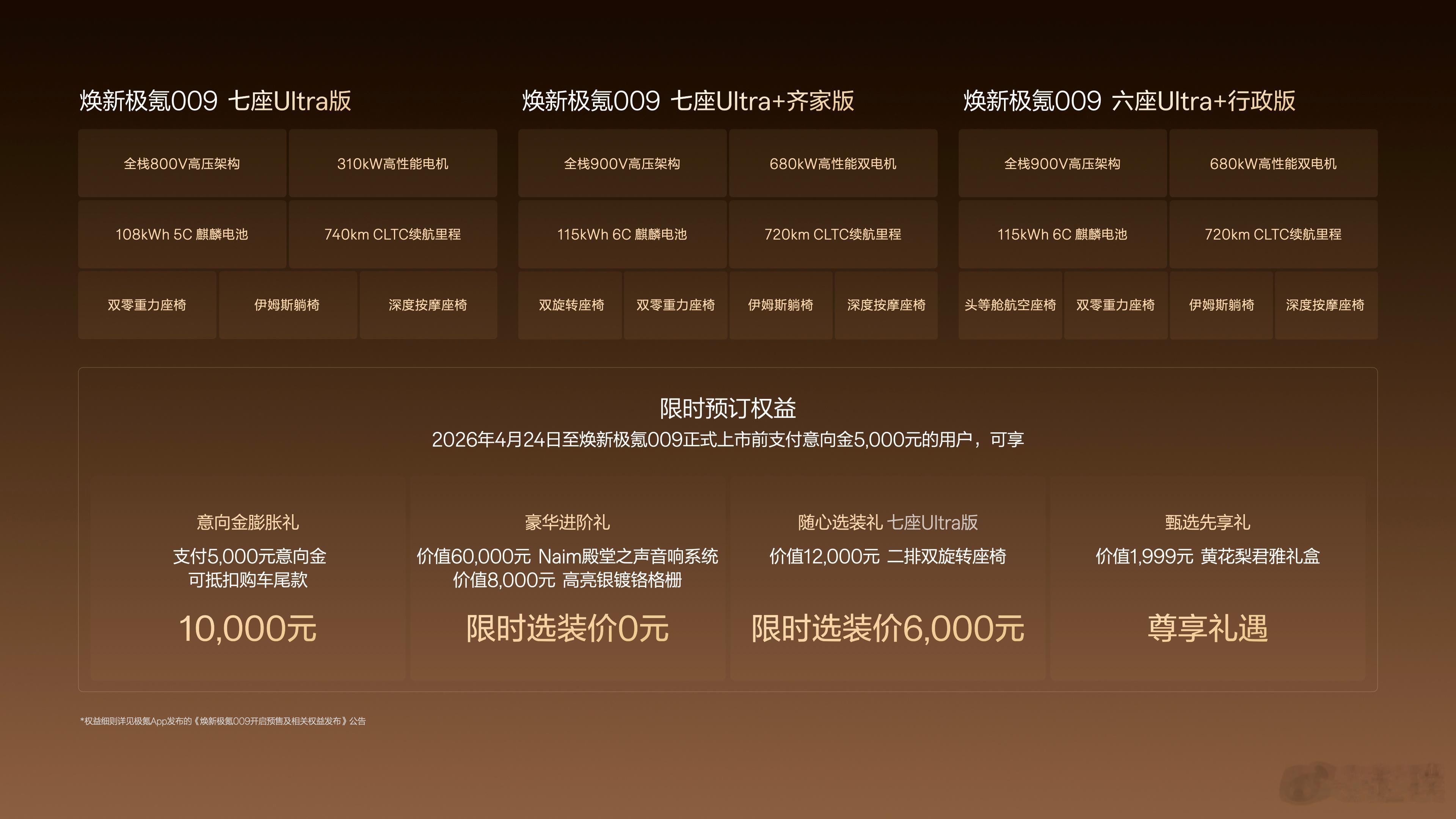 连续两年在40万以上豪华MPV中获得销量冠军的极氪009在2026北京车展 迎来了焕新版车型,并且已经开始预售,一共三个配置。新车除了在长相方面变化不大以外,很多硬件软件均有升级。动力部分搭载新一代900V「高性能碳化硅电驱」,双电机四驱峰值功率达 680千瓦。900V 115度麒麟电池,四驱车型CLTC续航达720公里。底盘悬架升级为「闭式双腔双阀空气悬架+CCD 电磁减振器」。辅助驾驶方面标配激光雷达,搭载千里浩瀚H7 G-ASD辅助驾驶系统,支持全场景辅助驾驶/智能泊车等功能。现款车型售价是43.9万起,新款车型有了这么多升级,大家猜猜价格会有什么变化呢?这就是北京车展焕新极氪009定档北京车展预售