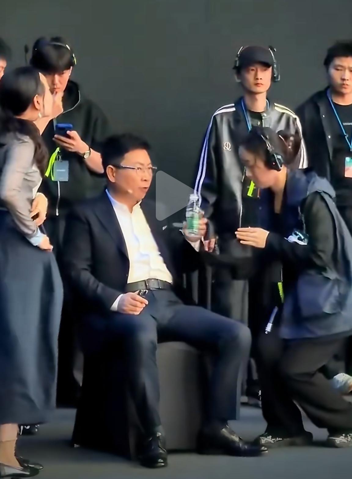 过了一会儿,又为余总拧开一瓶矿泉水,又膝盖微曲半蹲递给余总。余总全程面无表情,右手捶着自己的右腿,看上去腿部有些不舒服。