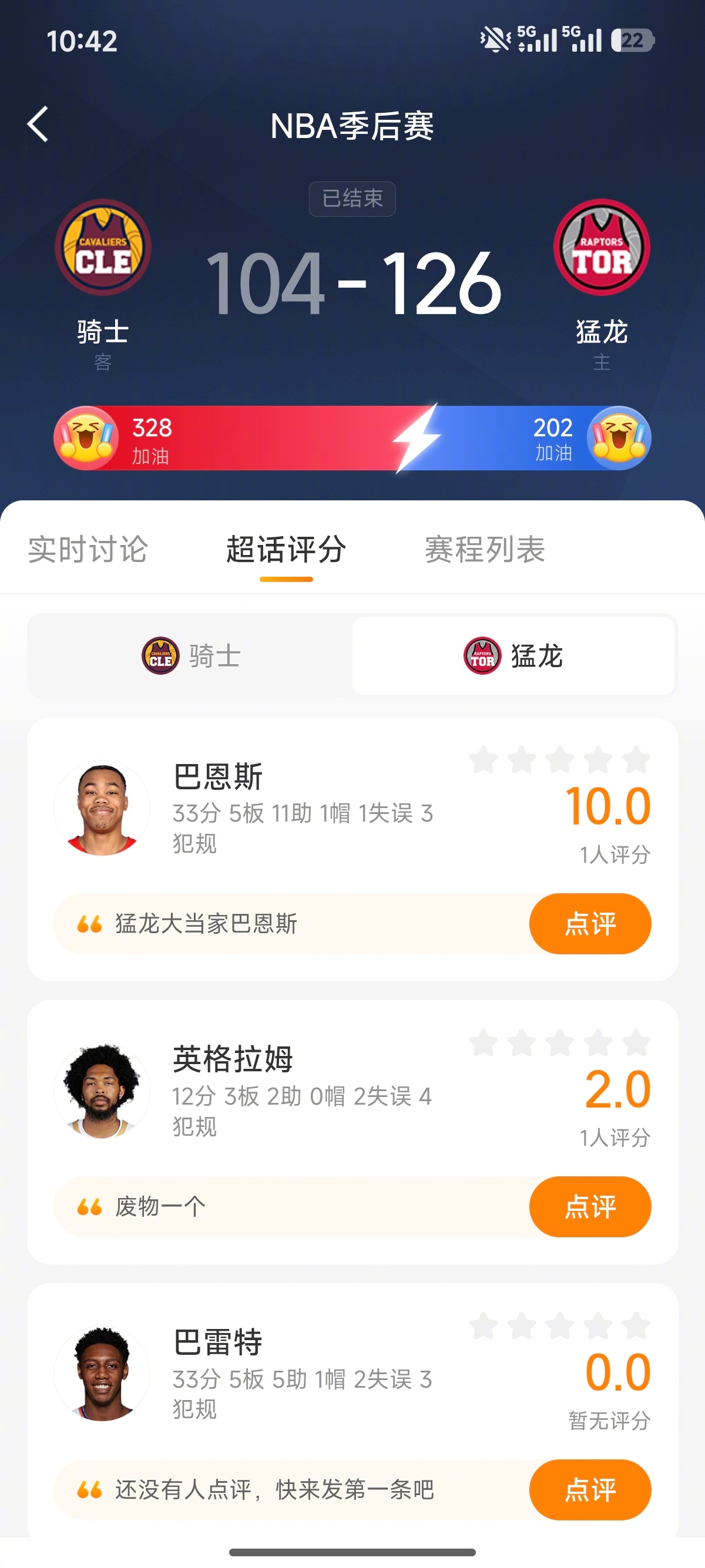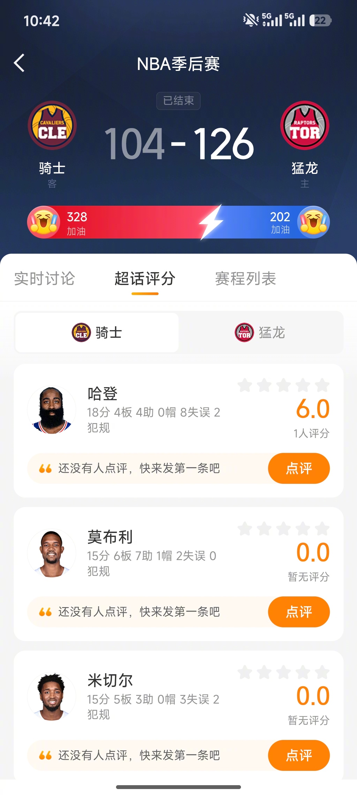 一起来超话多伦多猛龙NBA克利夫兰骑士为球员表现评分,有机会赢取20元神评红包激励~
